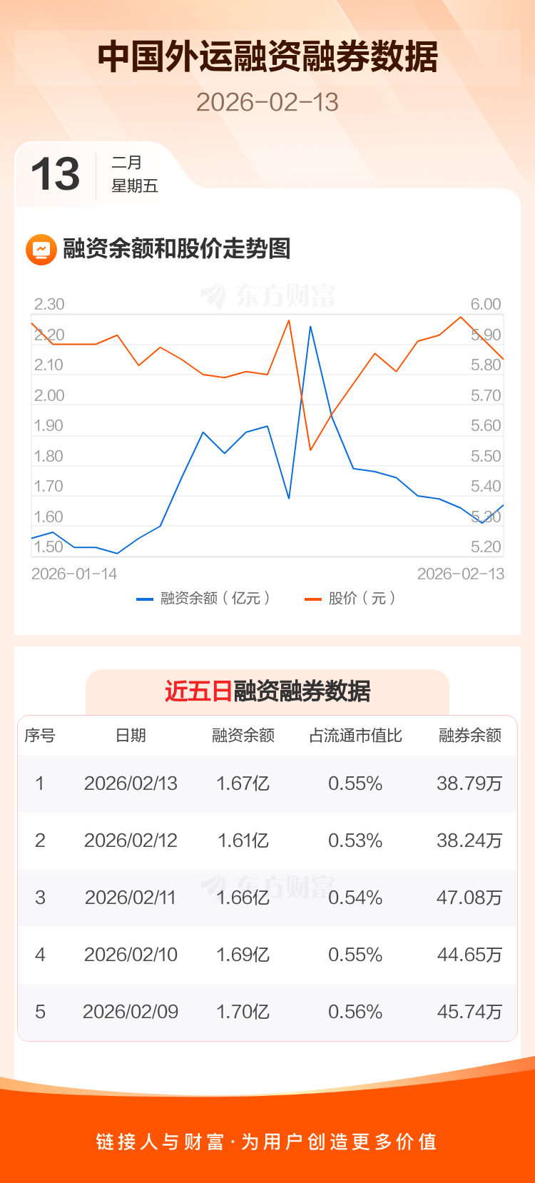 交易所最新数据显示,中国外运于2026年2月13日获融资买入1979.19万元,融资偿还1362.00万元,当日融资净买入617.19万元。目前,该股融资余额1.67亿,占流通市值比例为0.55%。
