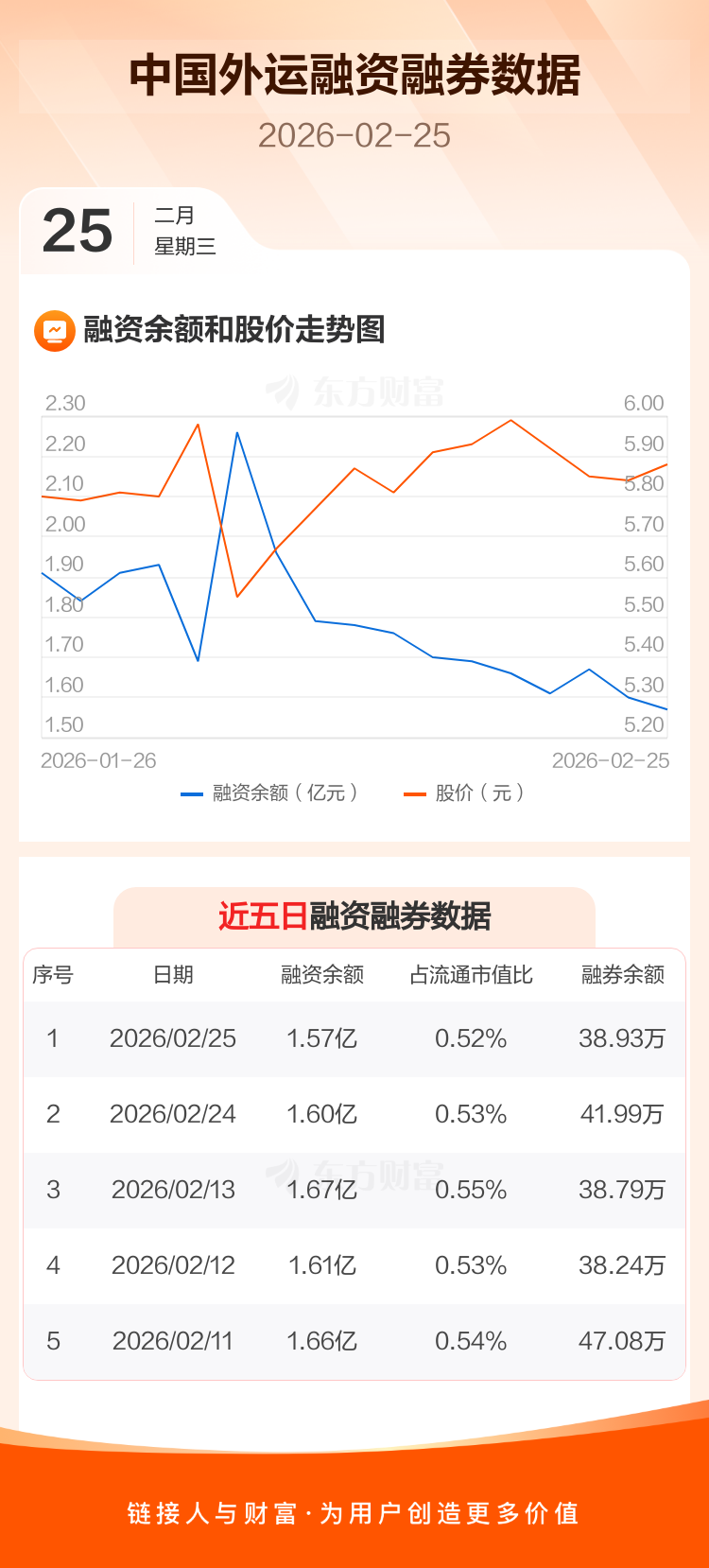 交易所最新数据显示,中国外运于2026年2月25日获融资买入621.43万元,融资偿还919.84万元,当日融资净偿还298.42万元。目前,该股融资余额1.57亿,占流通市值比例为0.52%。