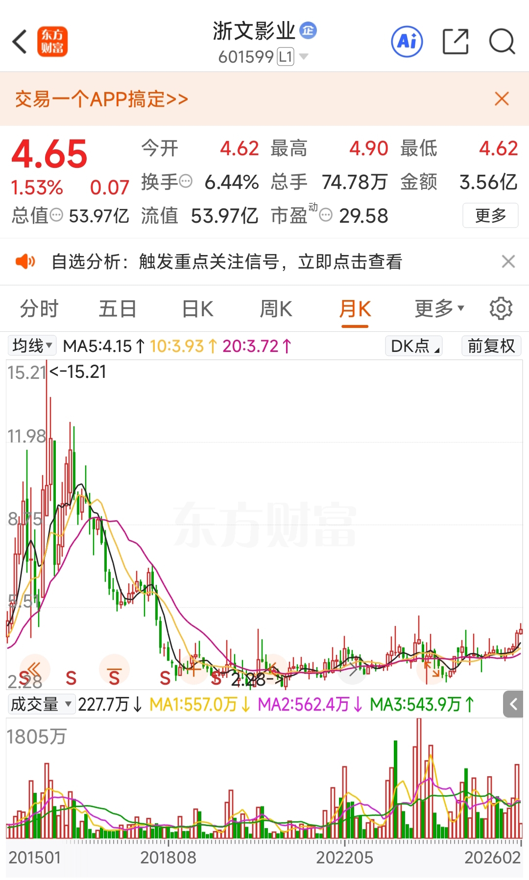 $浙文影业(SH601599)$ Ai+影视+文化传媒+短剧游戏+酒店+消费+纺织+国企+deepseek,10年大底月线突破,将攻击5.20元。2025年三季报净利润1.36亿元,每股收益0.12元
