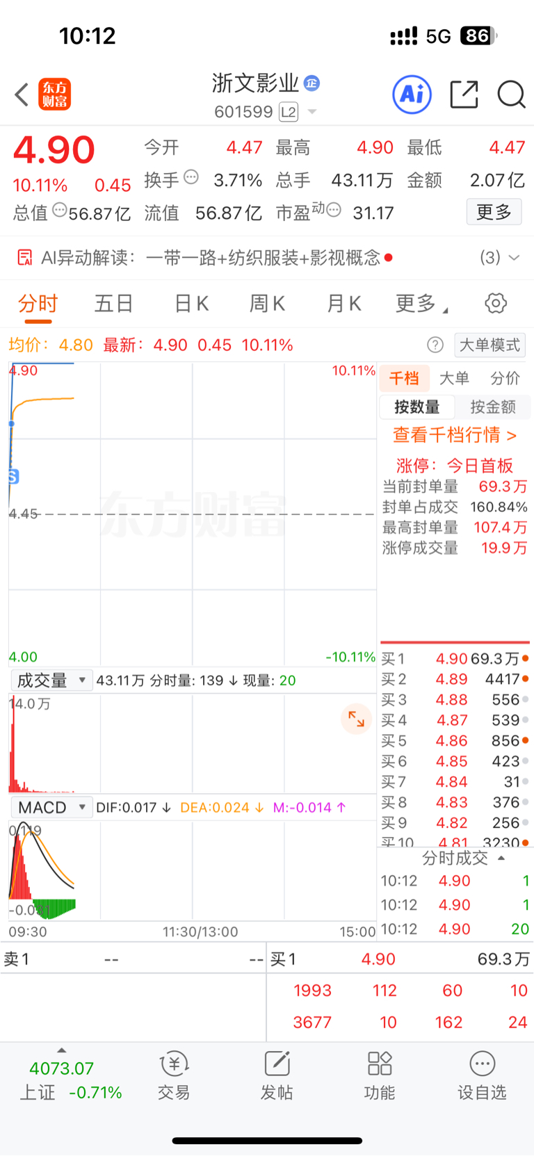 $浙文影业(SH601599)$ 昨天跌的时候我动都不动一下,今天涨点跑的飞快。。。