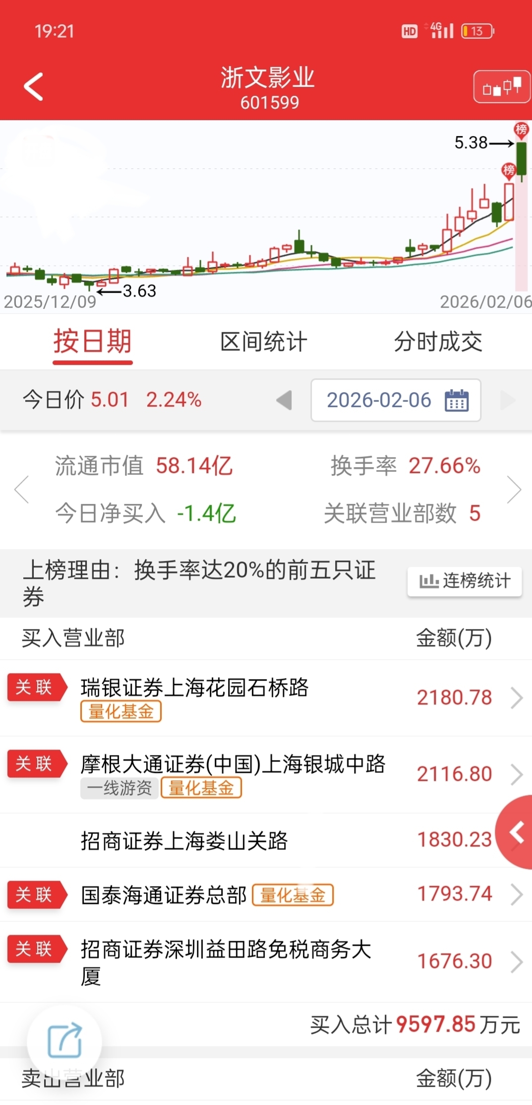 $浙文影业(SH601599)$ 浙文影业 ,已经连续两个交易日上了龙虎榜!年前年后电影电视剧是个热门!且形态上是滞涨的股,外资瑞银 摩根 高盛 这三个机器人游资还是很有水平的,有一线游资水平!外资机构,机器人量化游资水平挺好!!!我是胡说八道,请勿盲目跟风买入,炒股有风险,入市需谨慎。可以多看,但不能多干。管住手才是硬道理。