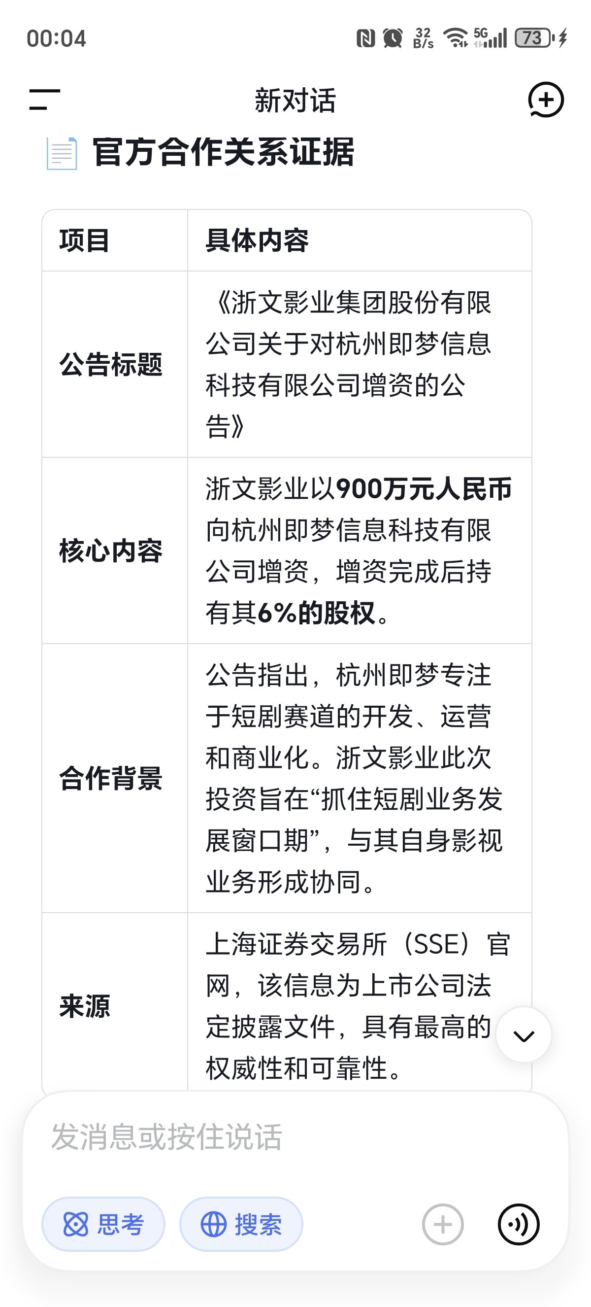 核心内容 浙文影业以900万元人民币向杭州即梦信息科技有限公司增资,增资完成后持有其6%的股权。真的假的?