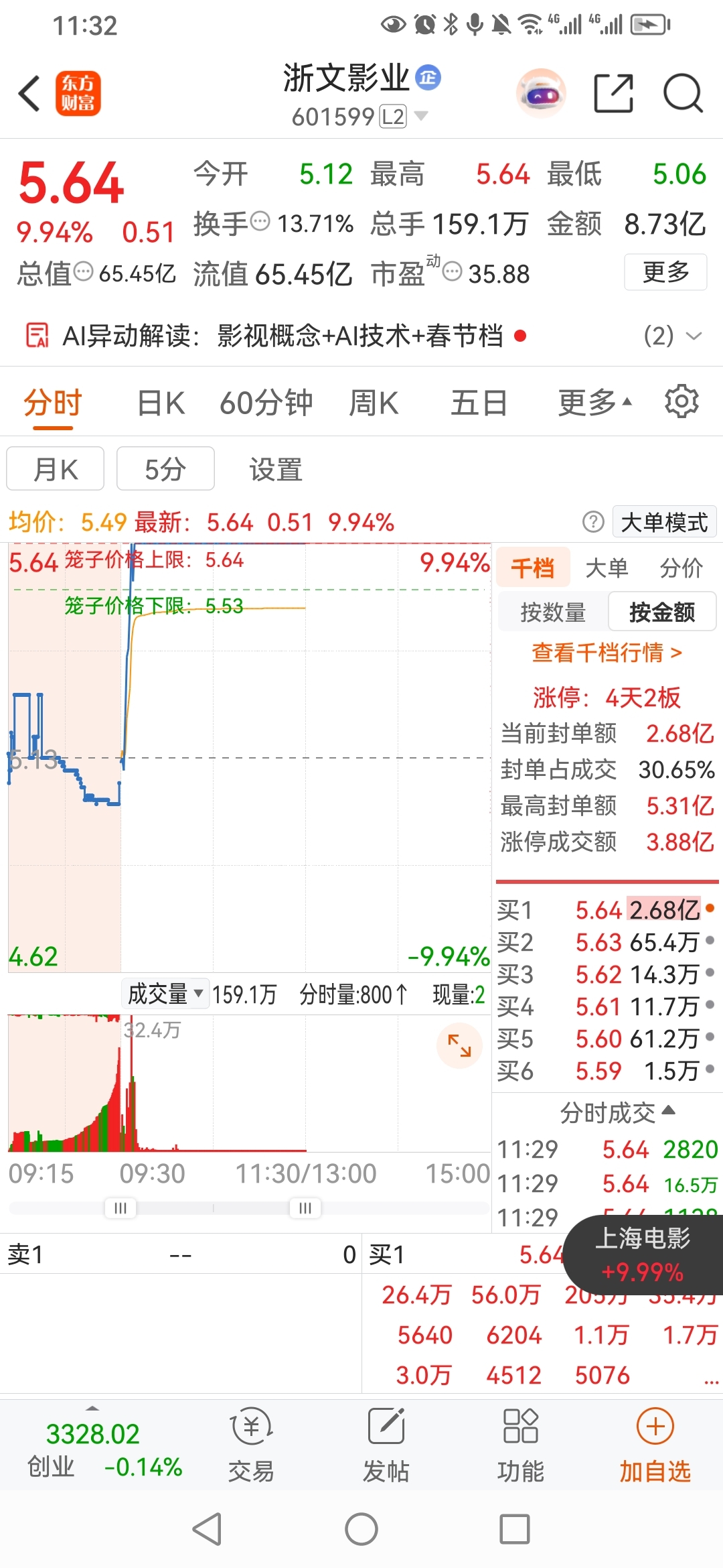 军哥,盯盘股票筹码,浙文影业601599。