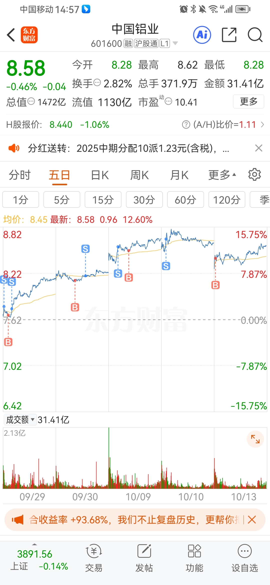 $中国铝业(SH601600)$ 上周五基本上是清仓卖出,今天按计划接回来一半底仓,拿到分红又可以多赚利润。#炒股日记# #复盘记录# 高抛低吸,低吸高抛