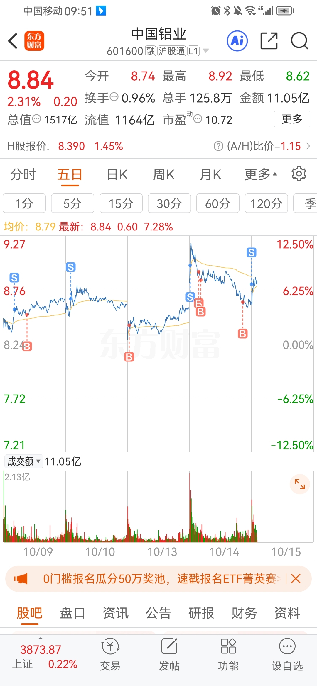 $中国铝业(SH601600)$ 8.64接的仓位8.81卖出去了,不贪心17格价差到手,#炒股日记# #复盘记录# 高抛低吸,低吸高抛