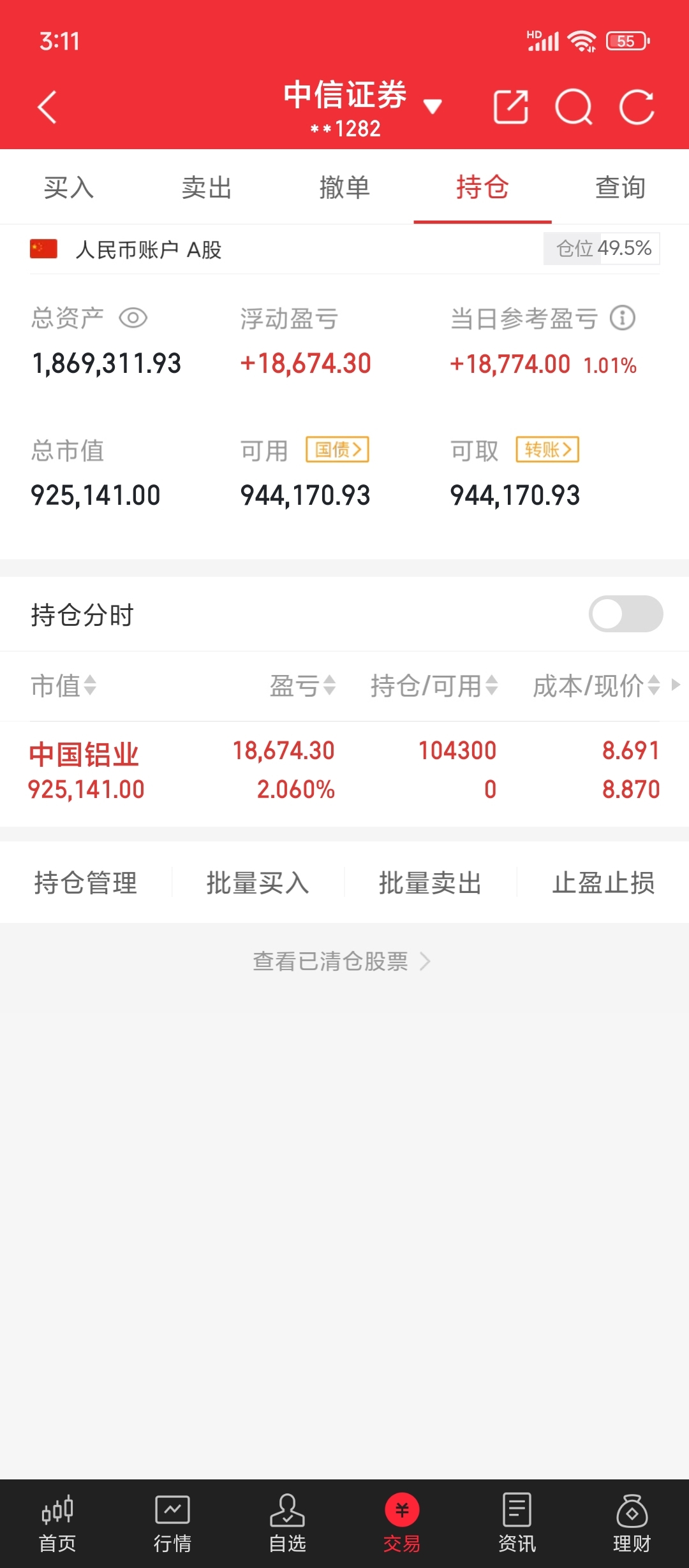 $中国铝业(SH601600)$ 弄了一半,还好红了,盘中有点小担心!