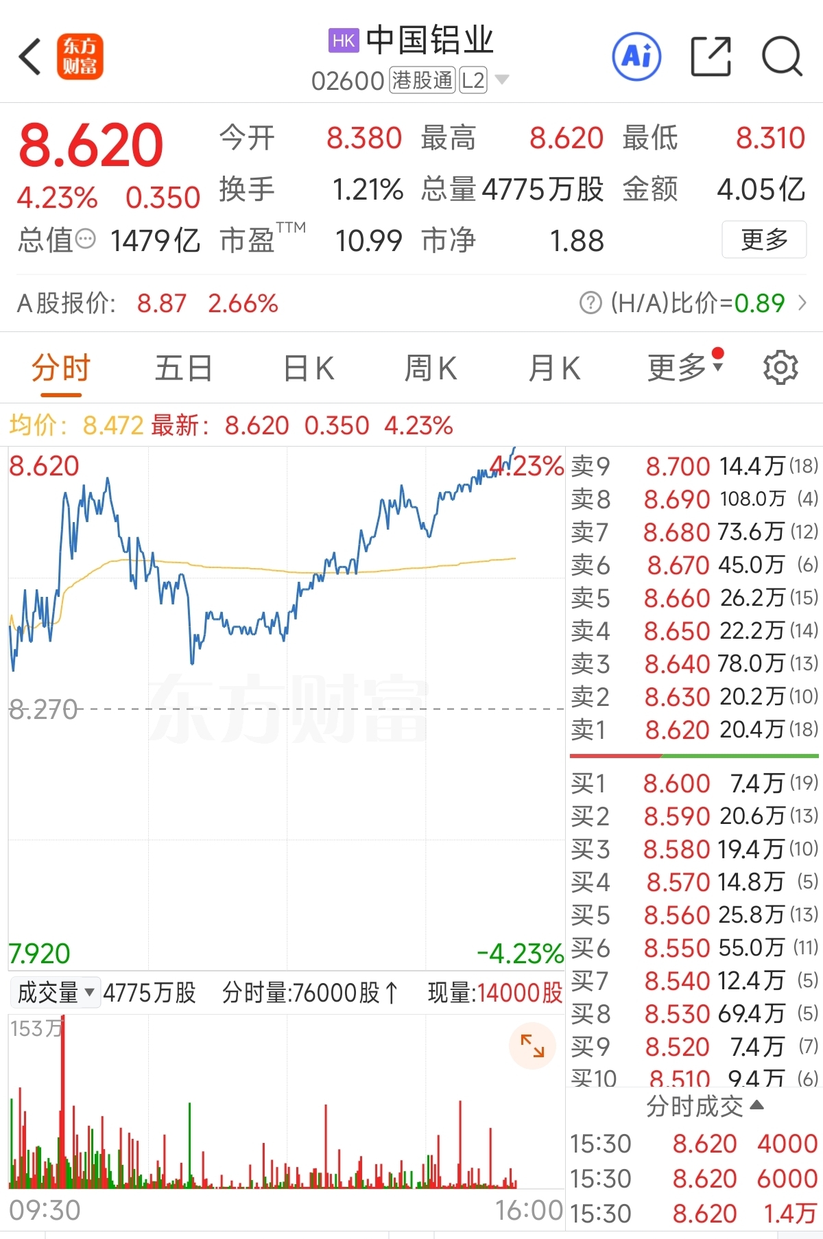 $中国铝业(SH601600)$ a股一收盘,h股就开始放飞自我了