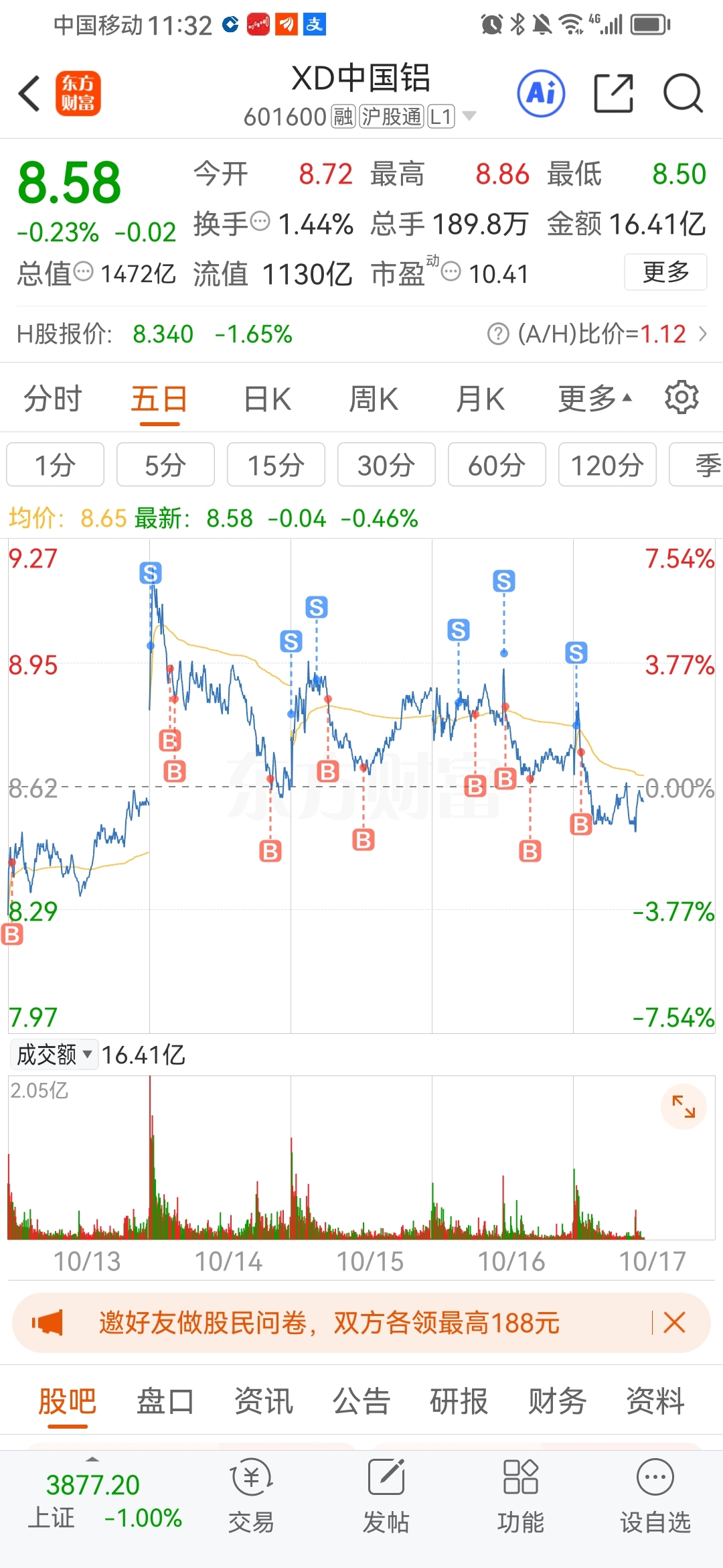 $XD中国铝(SH601600)$ 贪心了,没做好,下周继续手动分红,8.64的仓位,8.77卖出了,价差到手。安心等反弹#炒股日记# #强势机会# #复盘记录# 高抛低吸,低吸高抛