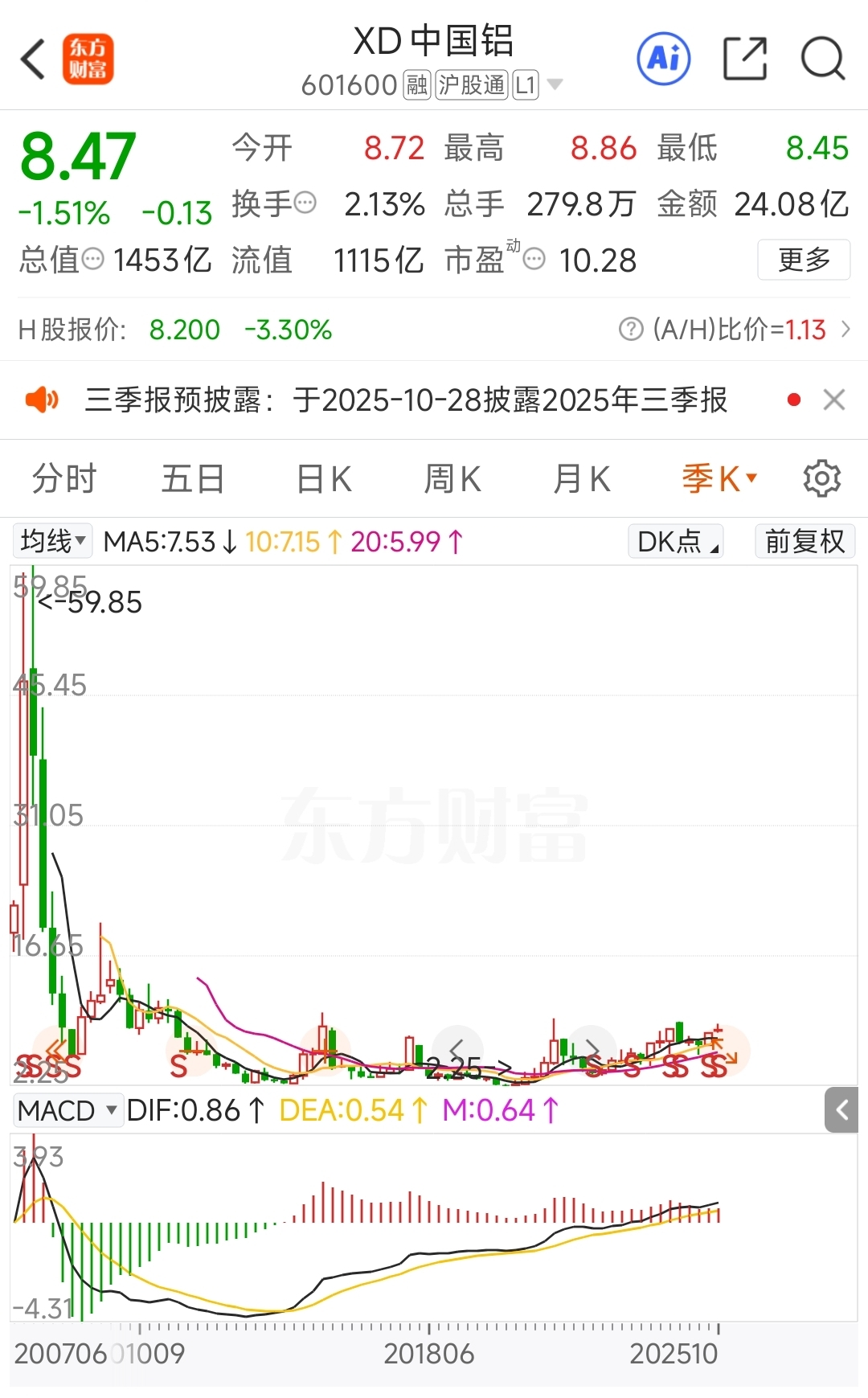 $XD中国铝(SH601600)$ 看季线,从2015年开始,整整10年在一个区间里震荡,一旦突破10元左右,不得了!