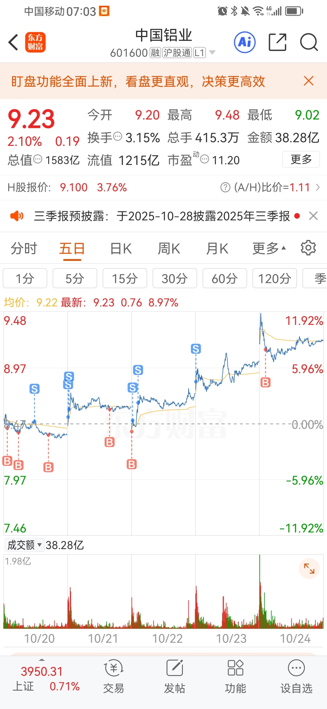 $中国铝业(SH601600)$ 周五分时价格线下,接回来一些仓位,周一又可以继续做波动#炒股日记# #强势机会# #复盘记录# 高抛低吸,低吸高抛