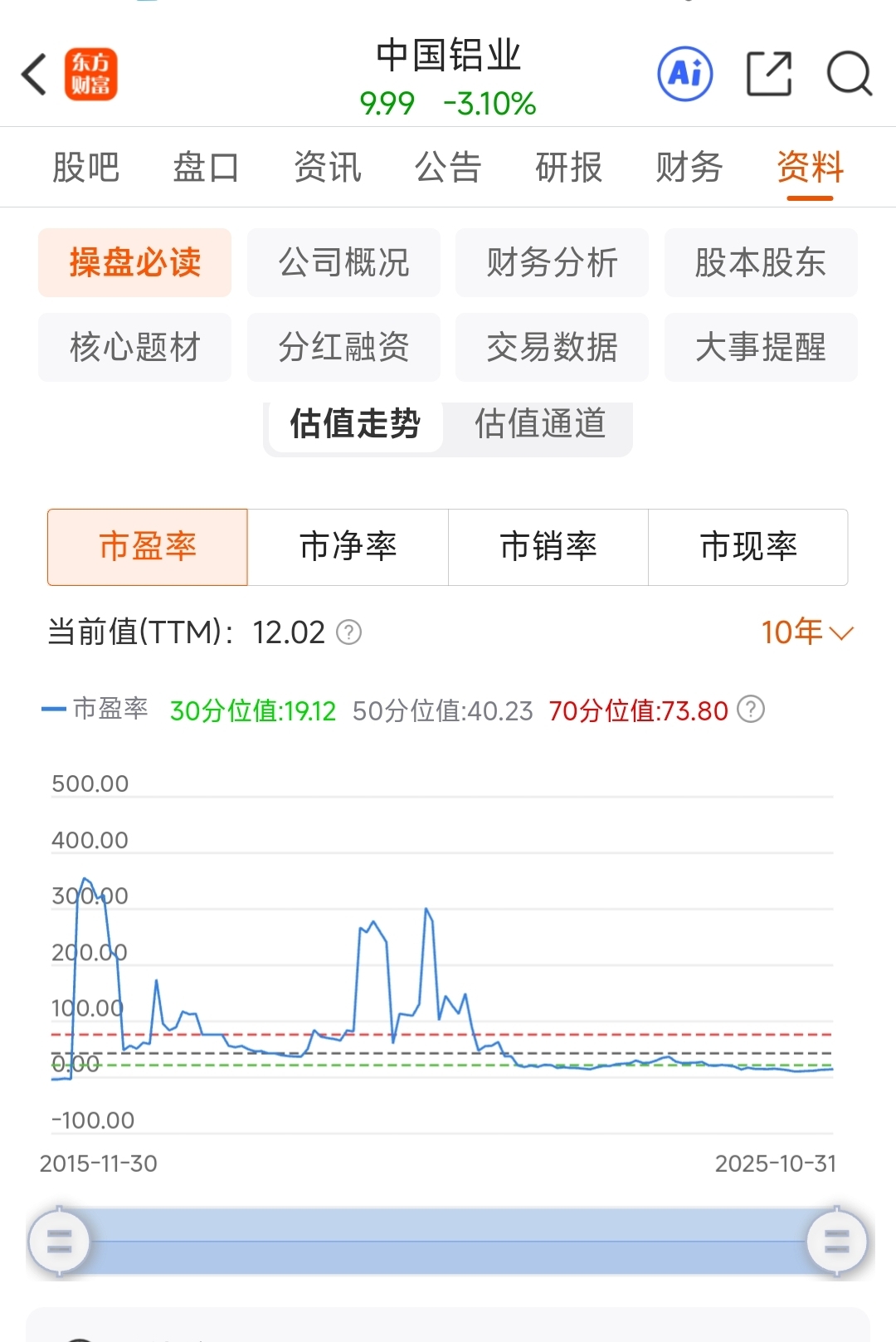 以铝业的市盈率为例,过去10年看,目前10倍左右市盈率明显低估,市盈率已经慢慢要走出底部区域了,等过几年如果达到30.40.50市盈率时,就说明逐步高估了