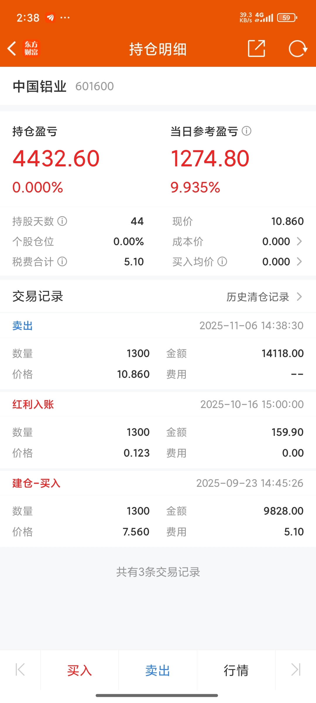 $中国铝业(SH601600)$ 卖出,四十个点,落袋为安