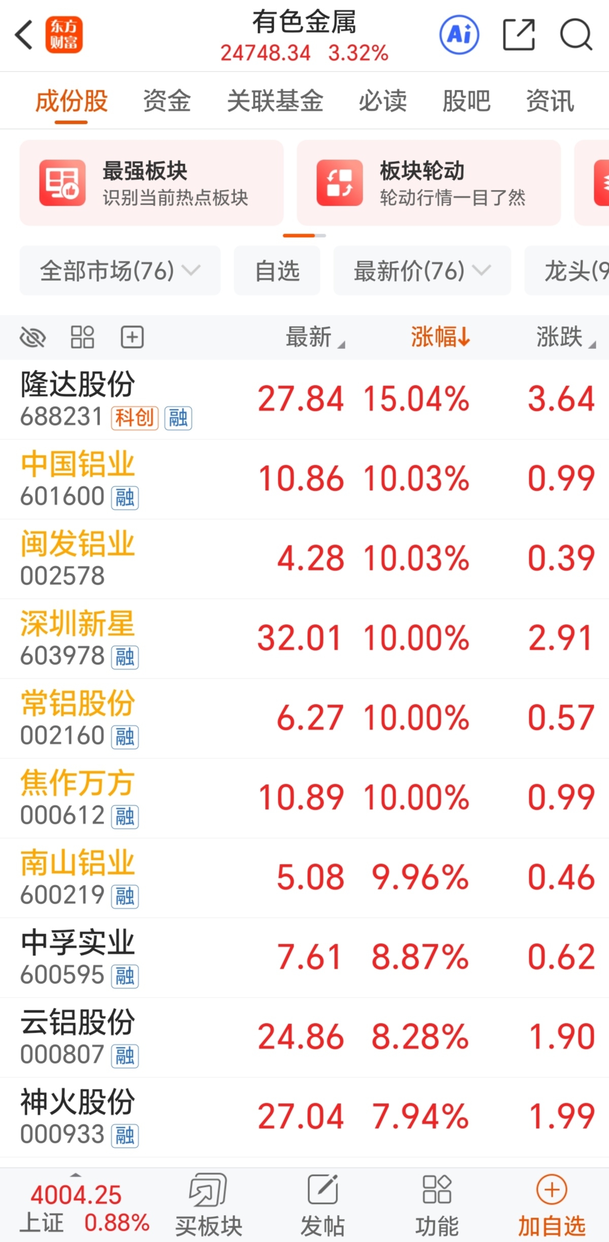 A股今日彻底沸腾!有色金属板块逆势暴走掀涨停潮,截至午盘,多只龙头股直线封板,板块指数盘中暴涨,成交量半日突破2000亿,资金抢筹迹象火力全开!铜价实时报85960元/吨,单日暴涨440元/吨;A00铝价同步攀升至21360元/吨,沪铜2512合约、沪铝主连合约分别上涨0.47%、0.28%,实物与期货市场共振上涨,这波行情绝非偶然!