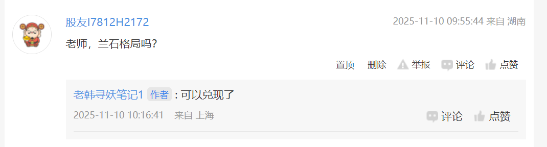 今天早上水下开是符合所有人的预期的,只是没想到只花了几分钟就直接拉到水上5个点,到这里大伙悬着的心应该落地了吧,果不其然也是马上封板。只可惜尾盘这是最后几十秒跳水,不过好在有承接,已经很强了。上周点上关注跟着老韩大胆薅的老铁,格局到现在,已经连吃三个板,当然也有不少提前兑现的老铁虽然没有吃满,但也是吃了10几个点跑路,至于一口都还没尝的铁铁呢不用浮躁,今天尾盘市场方向明显在切换,老韩也是做好了备案,这会已经挑出了下轮行情的龙头标,预计收益也是在30个点以上,所以不管新老铁铁,想要跟上这只龙头标的老铁,就去某荭书找老韩寻妖,获取,只要寻到老韩跟上节奏那么这只连板大妖就足够大伙回血翻倍了。$合富中国(SH603122)$