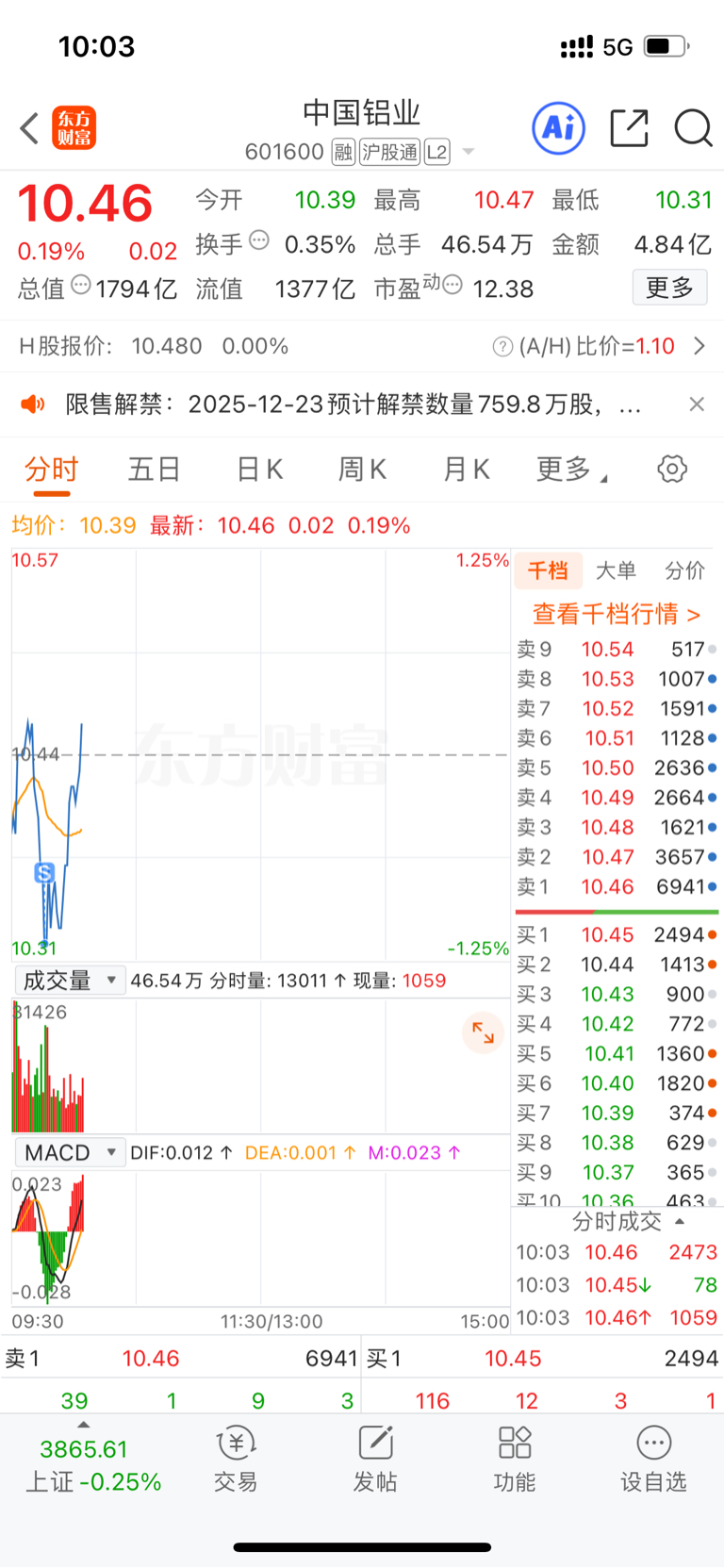 $中国铝业(SH601600)$ 条件单10.33,我不配拥有中铝