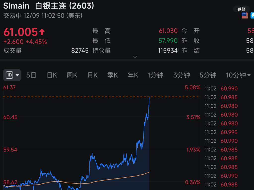 $中国铝业(SH601600)$ 白银创59.5元历史新高后,奔发式大涨60.5美元,又沖上61美元了,大涨4.5%了,电解铝及其他金属全面大