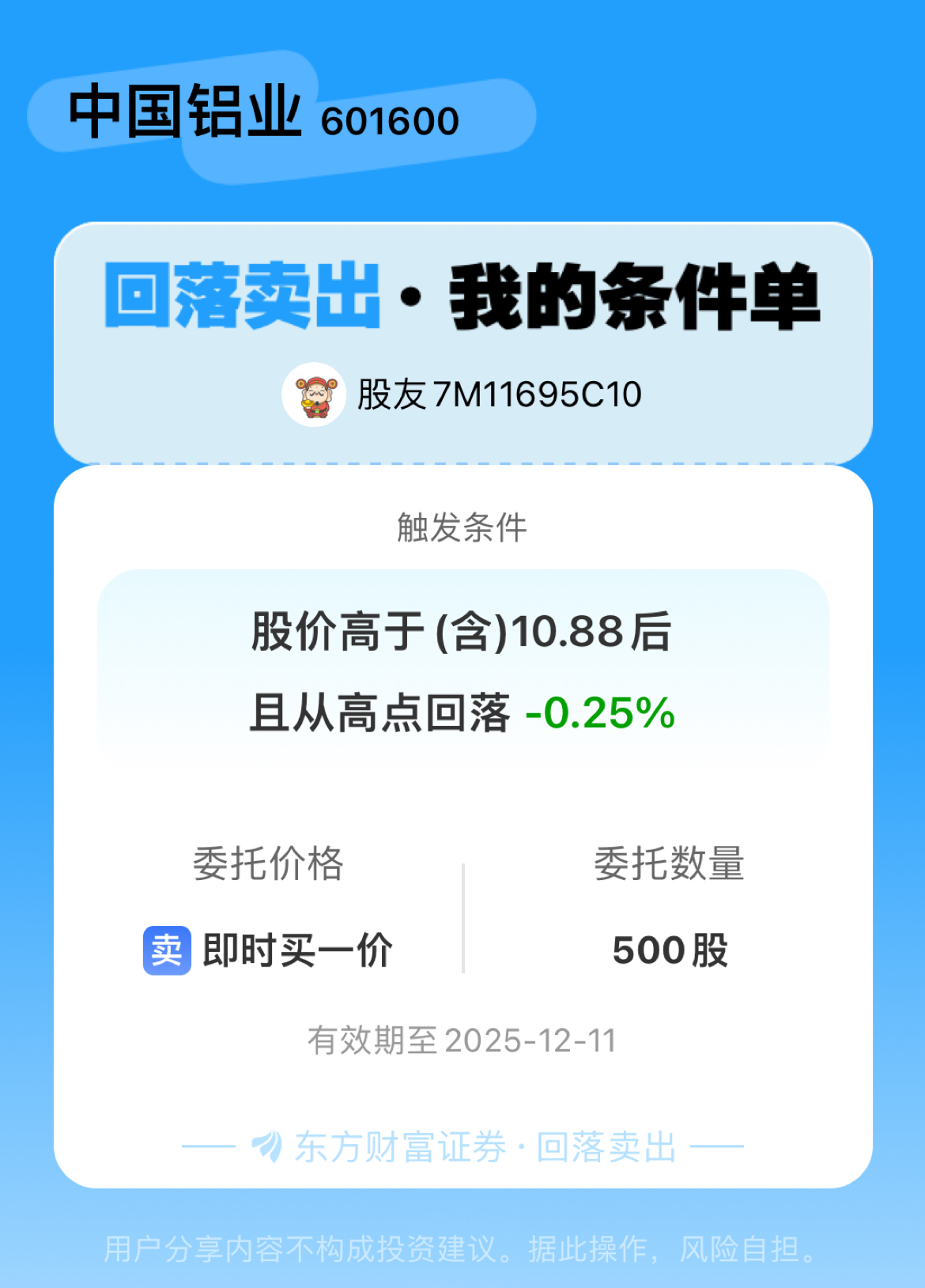 #条件单交流# #回落卖出晒单# 今天股价达到了设置的数值,怎么没有触发$中国铝业(SH601600)$
