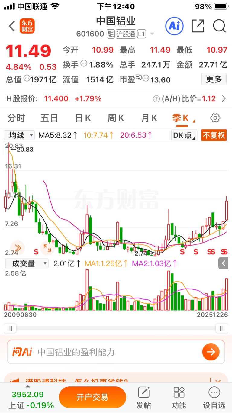 季K线创十五年新高,走出十元,盘了十五年底,月K线八连阳,史无前例,周K线结束调整,五周构头向上,