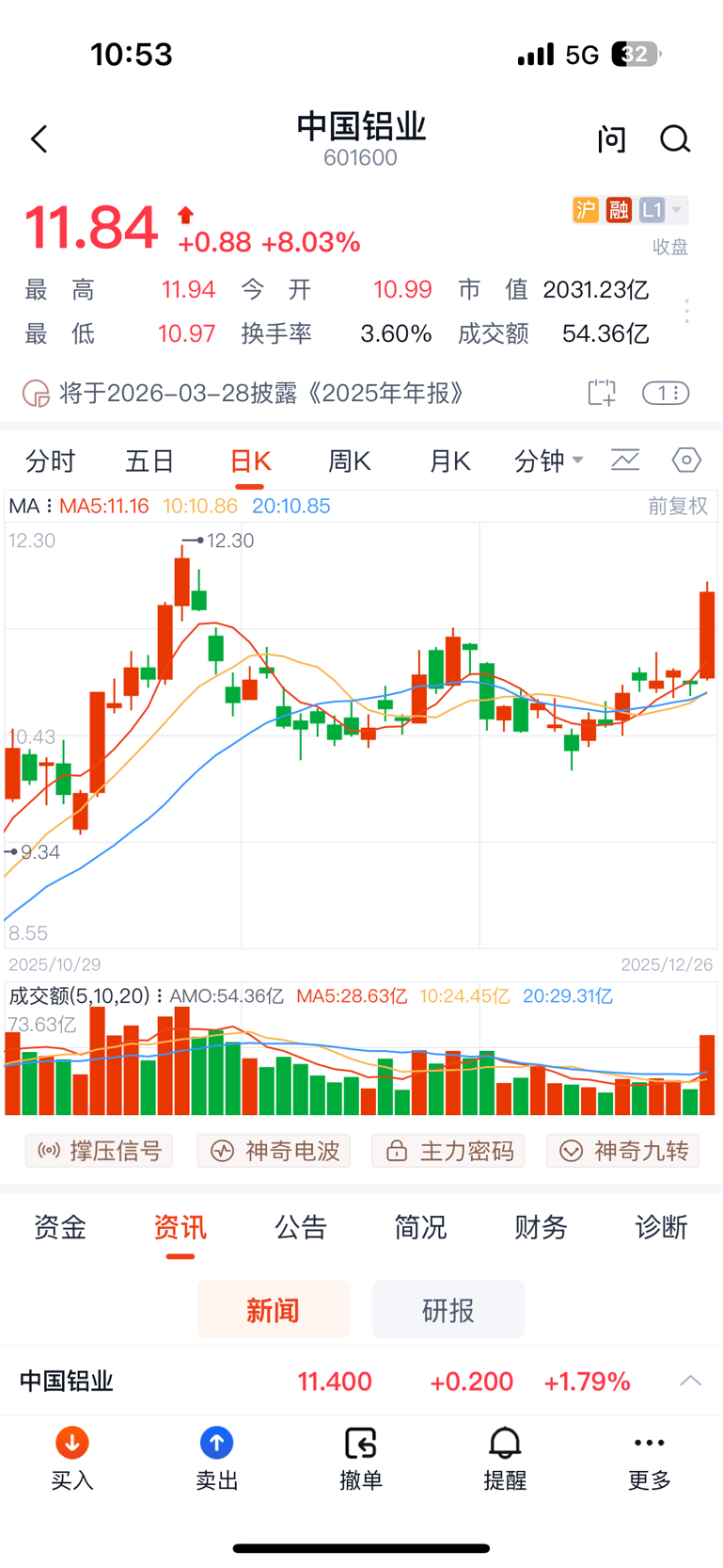$中国铝业(SH601600)$ 典型的W双低形态,只要大盘不出问题,过12.3没有问题。