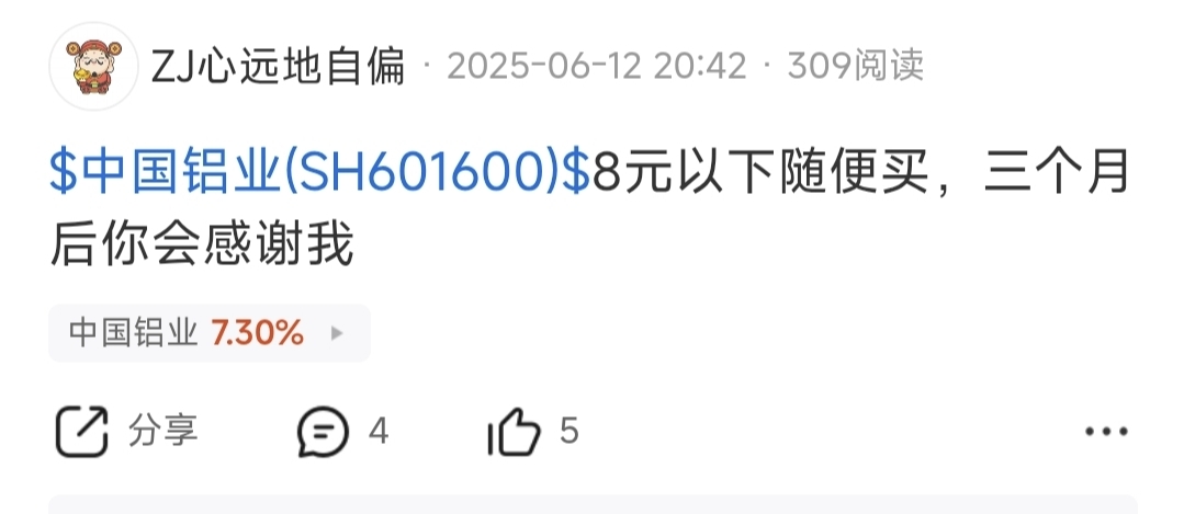 $中国铝业(SH601600)$ 这是25年6月12日发的帖子,当时股价是6.92元。想不到半年后还真翻倍了。