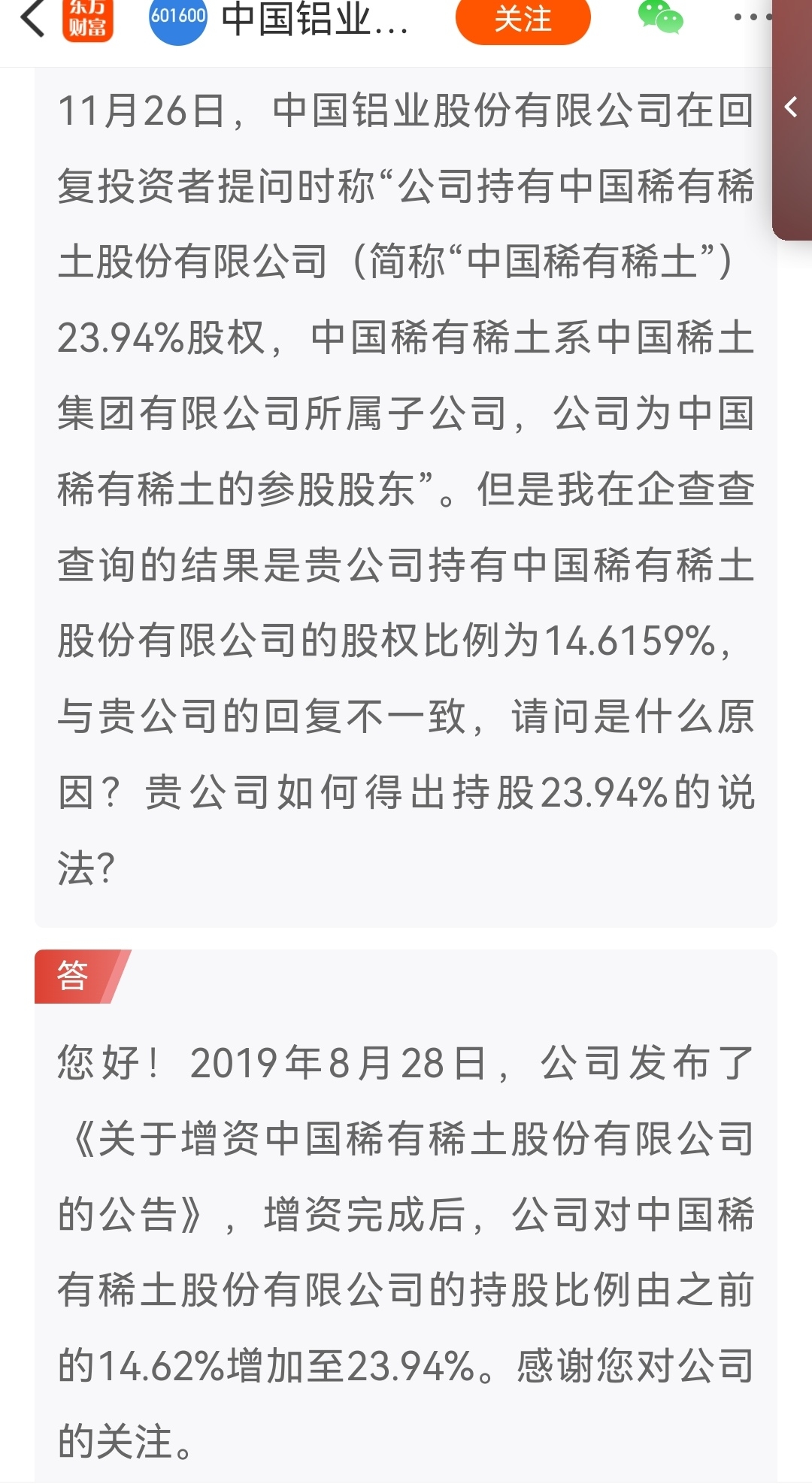 $中国铝业(SH601600)$ 中铝持有中国稀有稀土近24%的股份