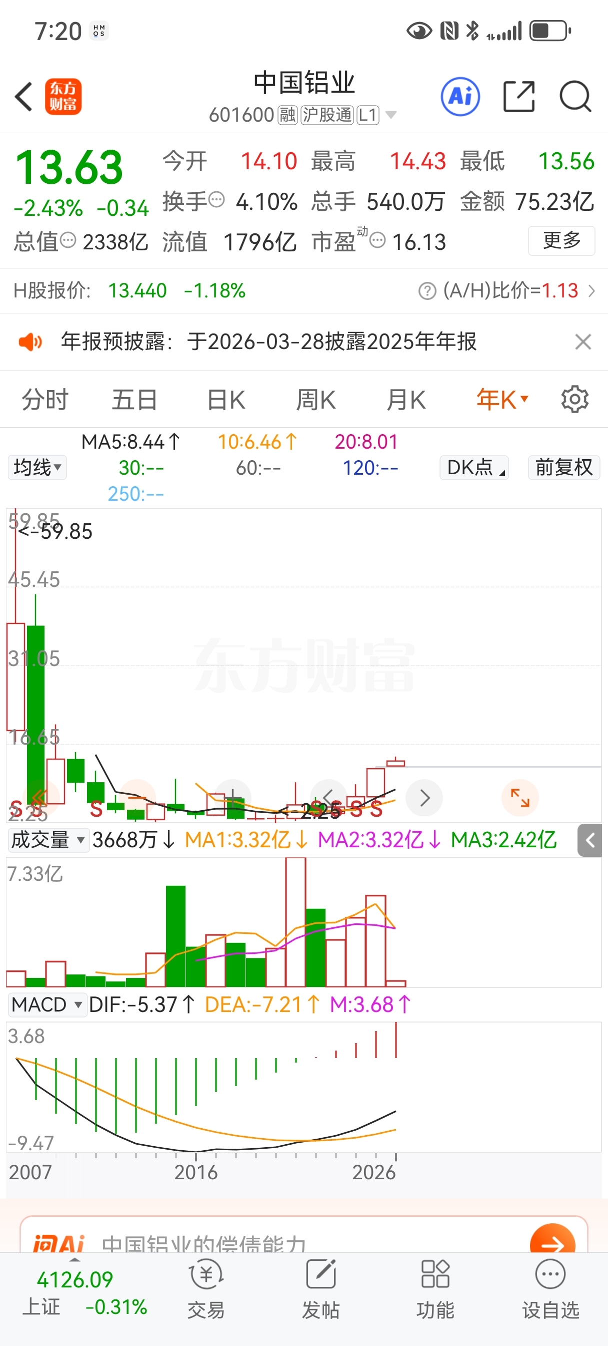 $中国铝业(SH601600)$ 这是欺负老实人啊,看到那个高点吗?被套20年了