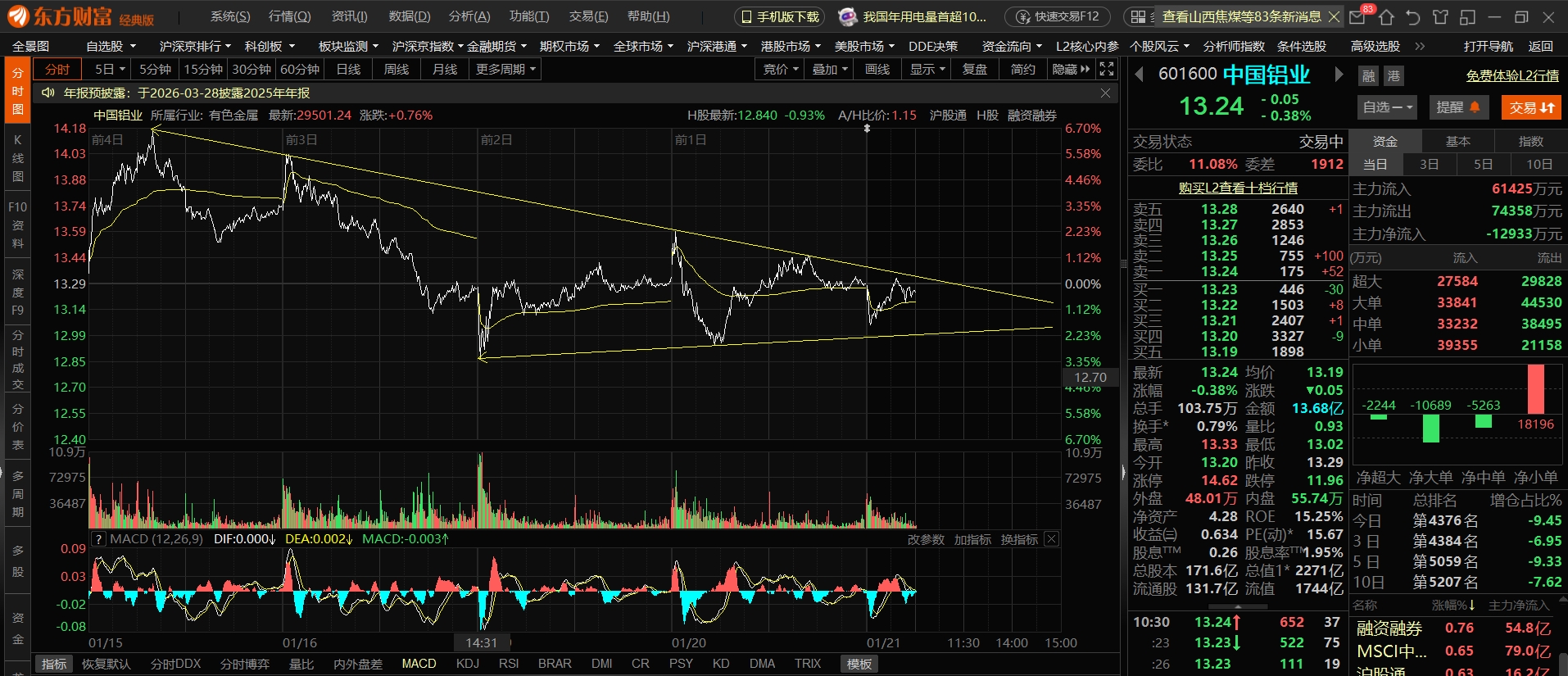 $中国铝业(SH601600)$ 5日收敛三角形,低点不断抬高,再坚持两天马上出方向,我认为突破上沿既拉高!!一周内必破13.8 祝兄弟们发财!