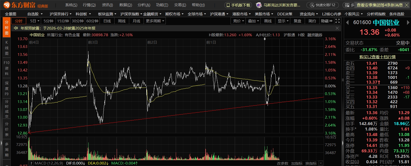 $中国铝业(SH601600)$ 连续5日,低点不断抬升,震荡上行,未来可期!!!!祝兄弟们一起发财!!!!