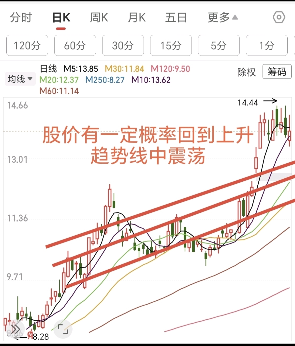 大家看一下我15号发的中国铝业分析!以及当时画的趋势图是不是相当精准!我预测的第一目标价位波动上沿14.6 正好是涨停板的位置!这就是为什么开板的原因!因为这里阻力极强!这里会不会直接拉第二目标价位还要观察,贸然打板很容易被套!