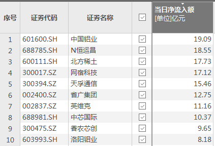 上证报中国证券网讯 Choice数据显示,1月28日,资金净流入额排名前十的个股依次是中国铝业、恒运昌、北方稀土、网宿科技、天孚通信、省广集团、英维克、中芯国际、香农芯创、洛阳钼业。其中,中国铝业获净流入19.09亿元。