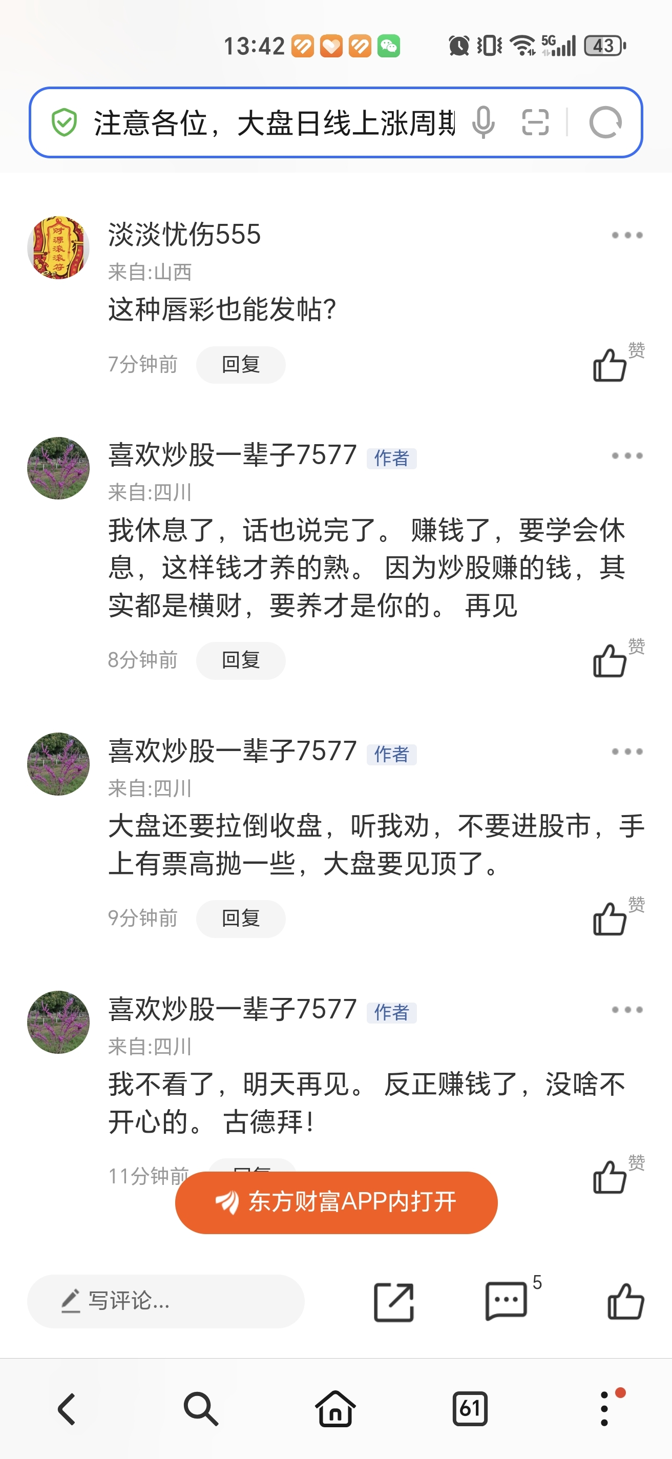 温馨提示: 1.根据《证券法》规定,禁止编造、传播虚假信息或者误导性信息,扰乱证券市场;2.用户在本社区发表的所有资料、言论等仅代表个人观点,与本网站立场无关,不对您构成任何投资建议。用户应基于自己的独立判断,自行决定证券投资并承担相应风险。《东方财富社区管理规定》