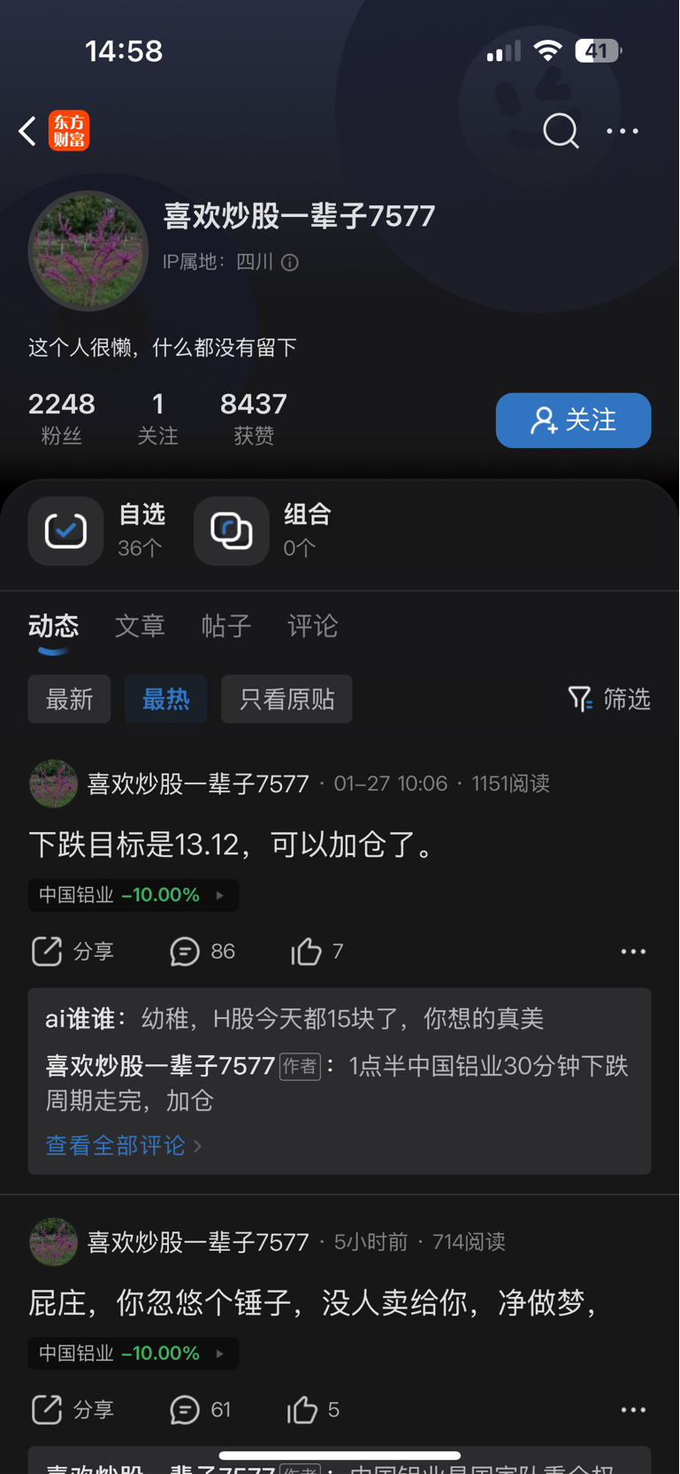 $中国铝业(SH601600)$ 跟这哥们反着来就行