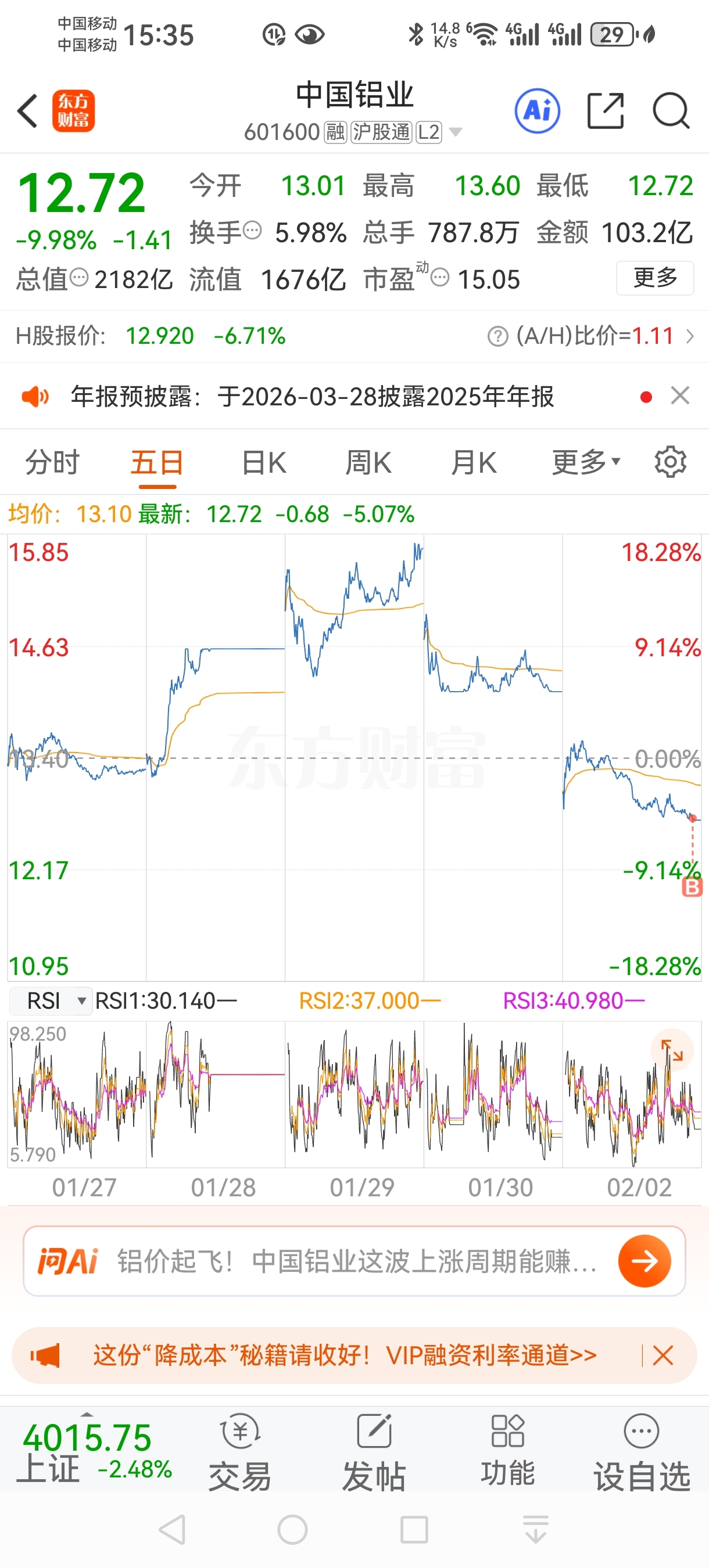 $中国铝业(SH601600)$ 明天低开在补一点