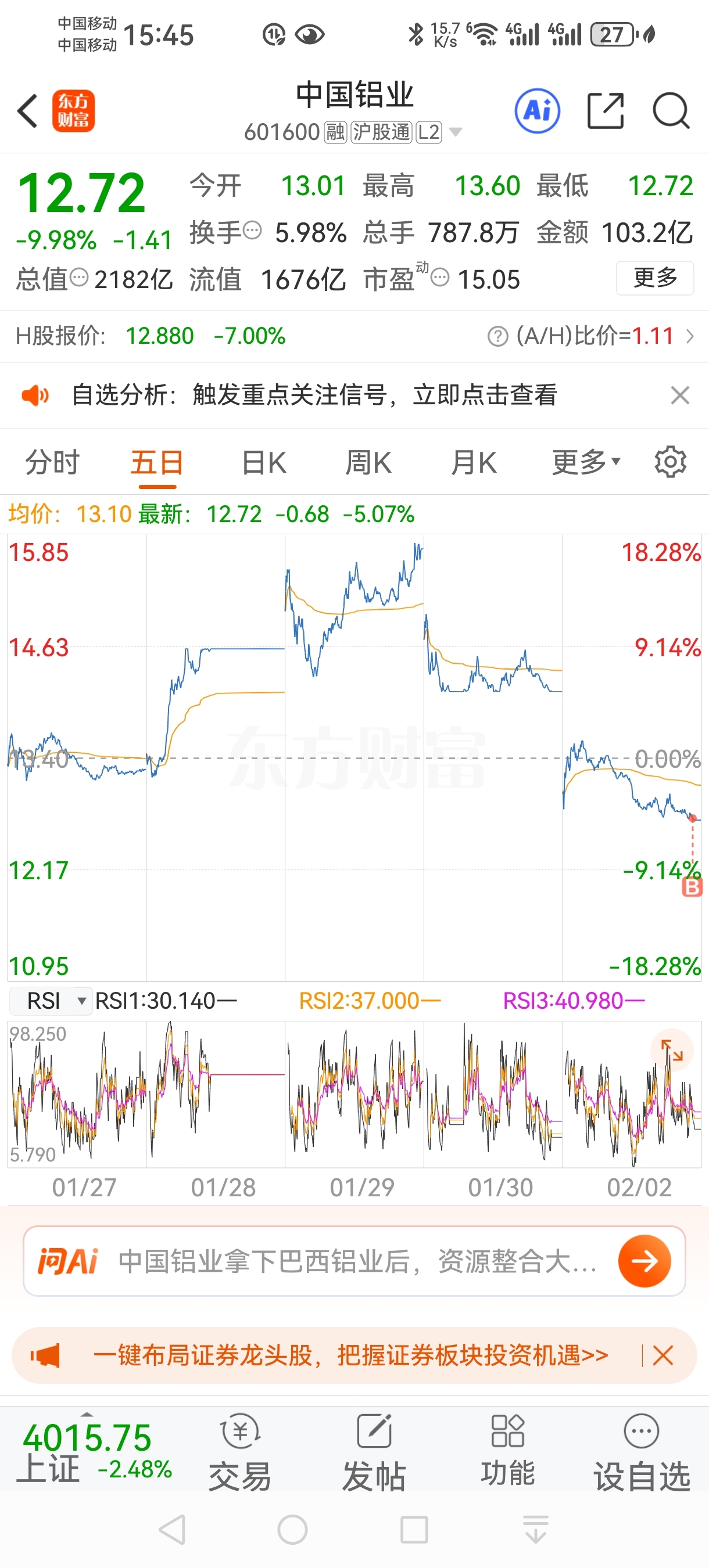 $中国铝业(SH601600)$ 这个票以前买过,记得当天是6个多点出了尾盘不到一个点收盘感觉是在洗盘没进错过了一波行情,今天感觉也知道是早还是晚,只是感觉和浙文互联第二波启动之前那个跃停有点相似,纯属个人观点不喜勿喷