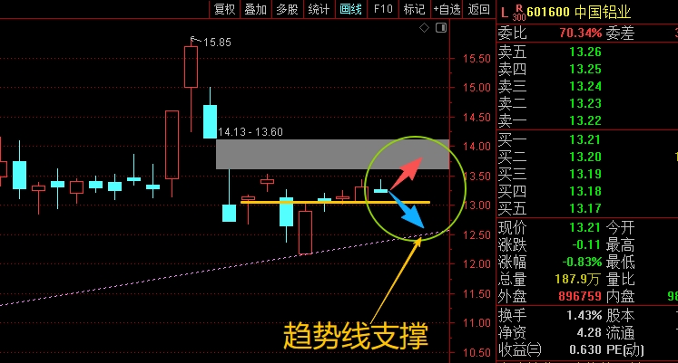 $中国铝业(SH601600)$ 近期主要是高位回落下来的震荡整理,短线来看,关注横线位置的得失,如果站稳就没问题,震荡看涨,回补头上缺口,但如果回落的话,就要看脚底趋势线的支撑情况了,能稳住就还行,兜不住就要注意破位风险了,控制好仓位应对。
