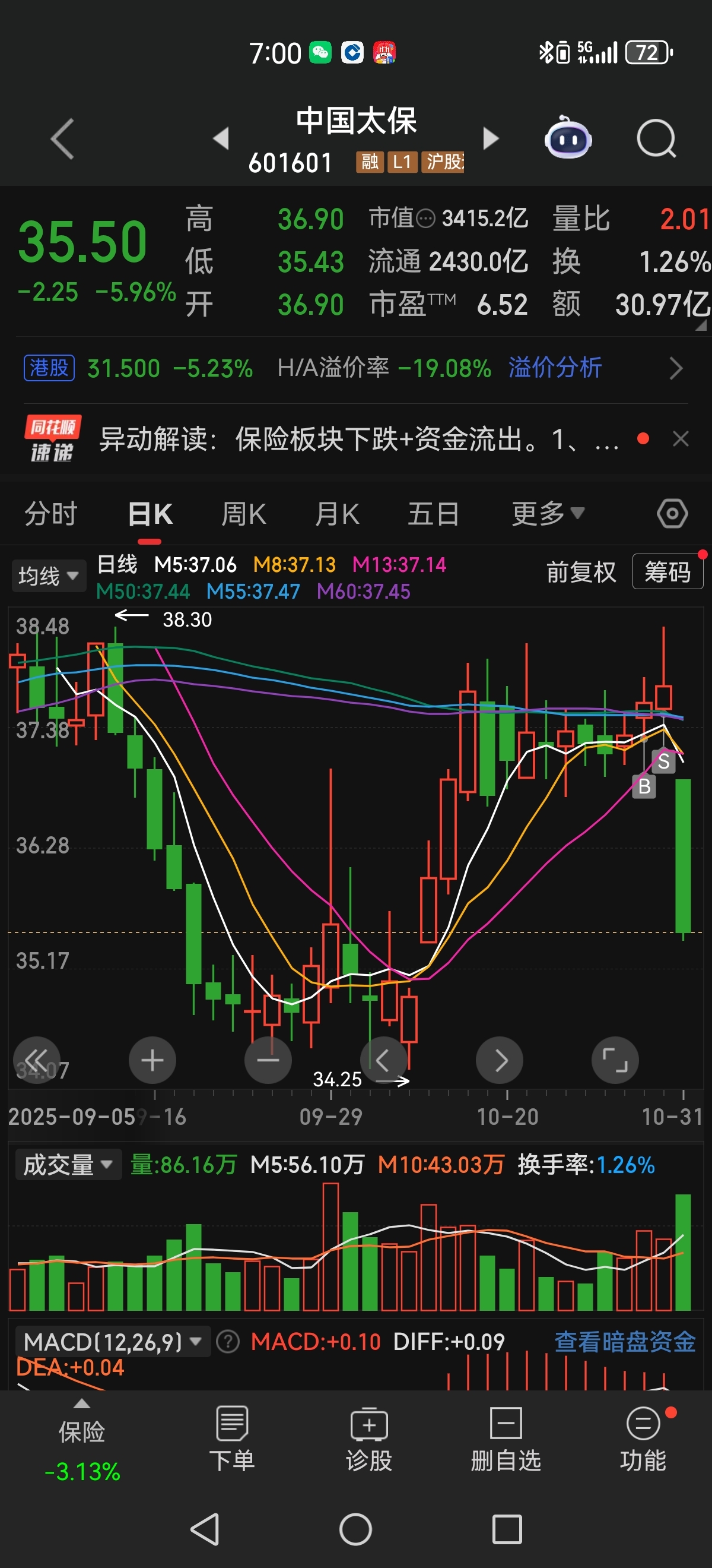 $中国太保(SH601601)$ 这种市场只能游击战,1200股隔夜卖,后怕呀