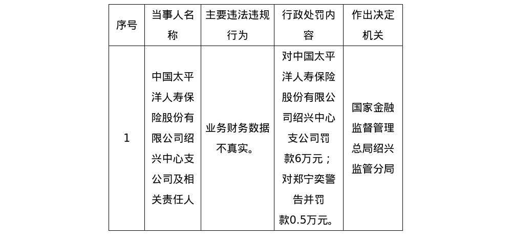罚单显示,中国太平洋人寿保险股份有限公司绍兴中心支公司的主要违法违规事实为:业务财务数据不真实。