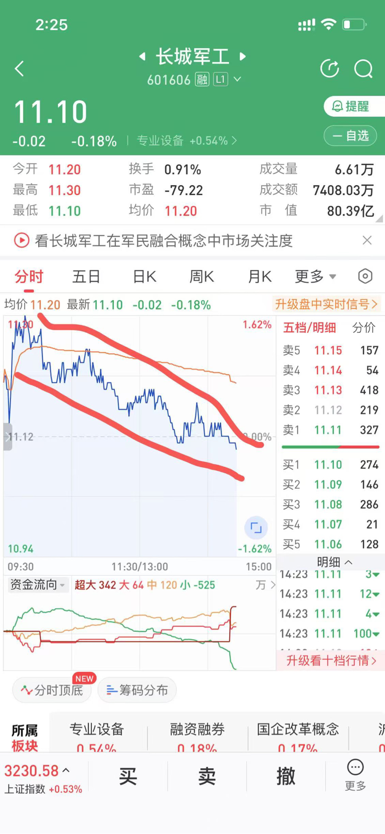 $长城军工(SH601606)$ 多么标准的下跌通道,没有比这个更标准的了,今天买的人是真少脑子了