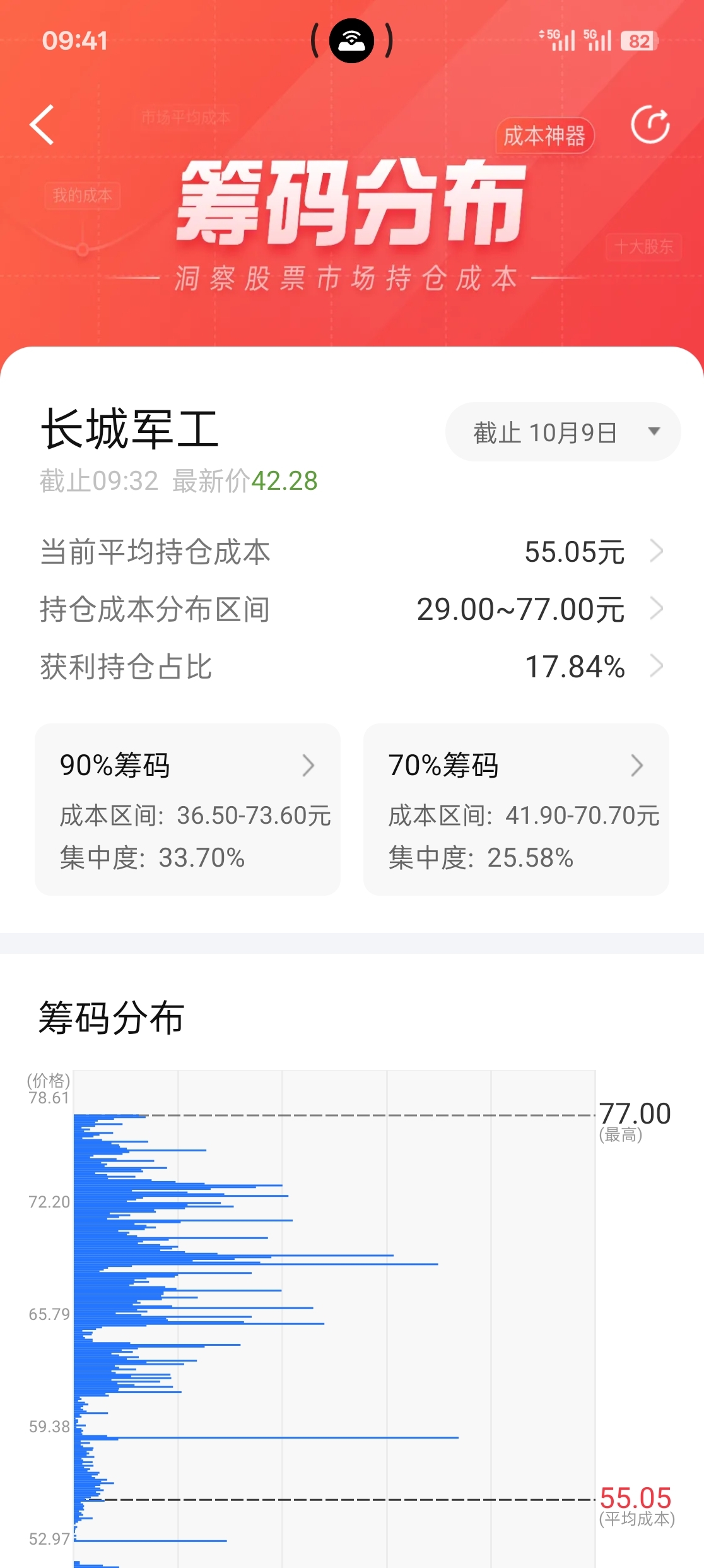 $长城军工(SH601606)$ 长城军工套牢盘93%了,彻底陷入恶性循环了,哪个主力也不敢拉了,一拉就有抛盘,这个票彻底完犊子了