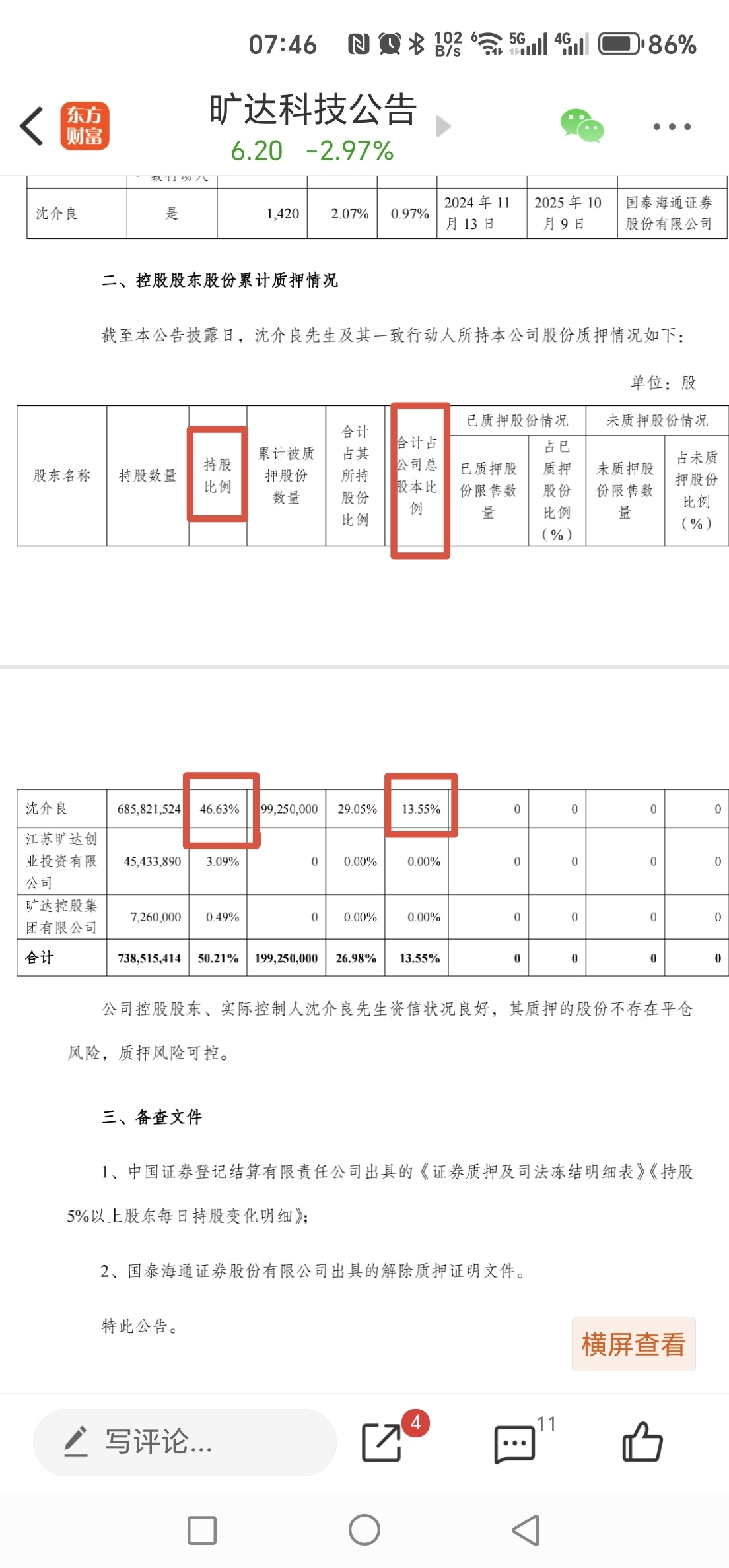 沈介良共持有46.63%旷达科技,28%转让给株洲国资,另外还要拿出10%旷达科技的股份质押给株洲国资,经过计算沈介良至少还要从其它地方解除质押4.92%旷达科技的股份才能凑足10%的股份质押给株洲国资,所以后续沈介良还有解除质押股份的公告。