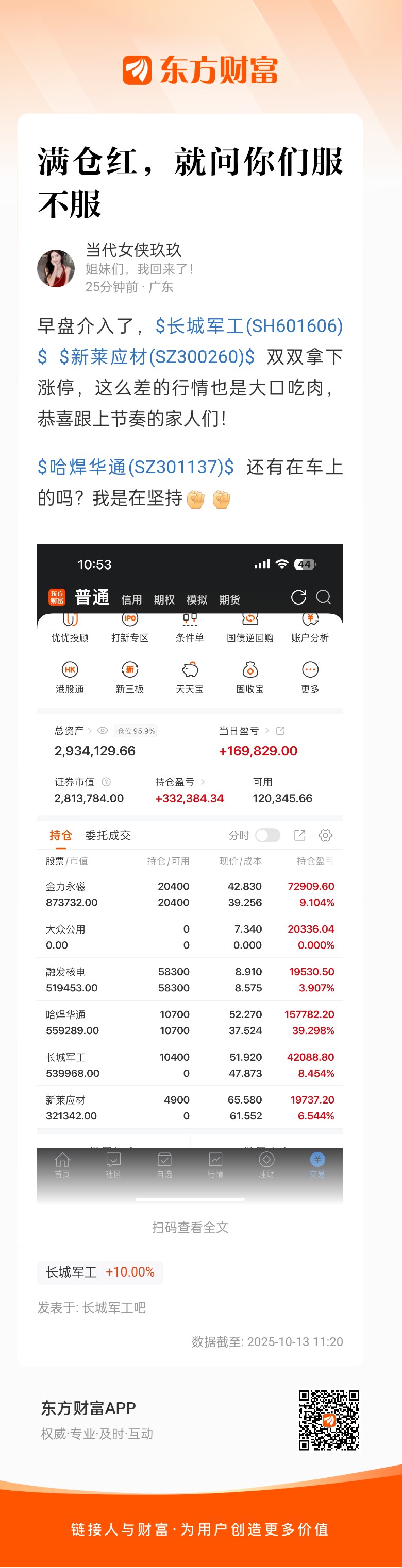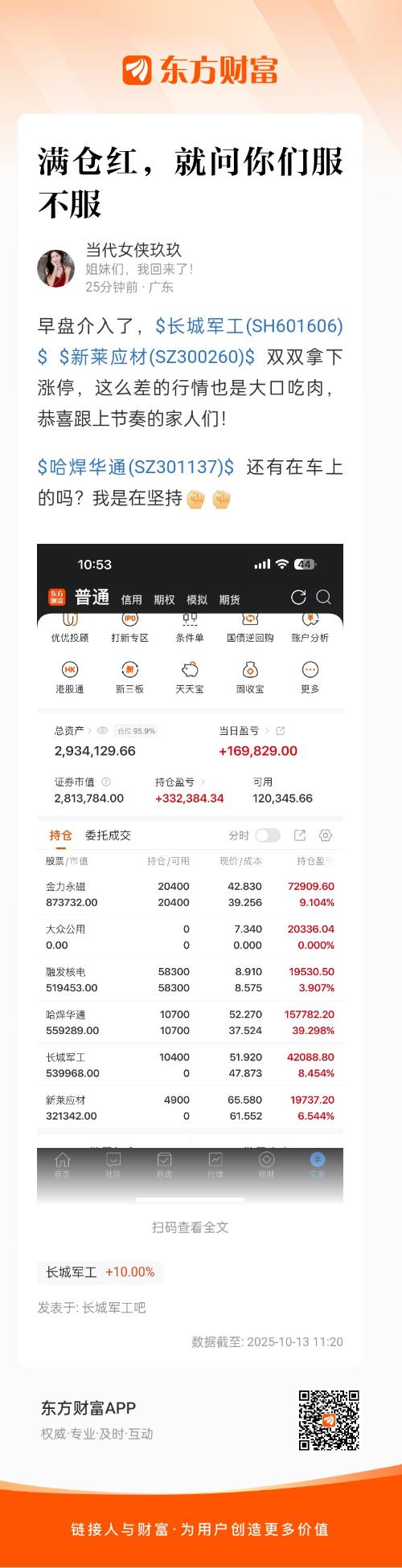 早盘介入了,$长城军工(SH601606)$ $新莱应材(SZ300260)$ 双双拿下涨停,这么差的行情也是大口吃肉,恭喜跟上节奏的家人们!