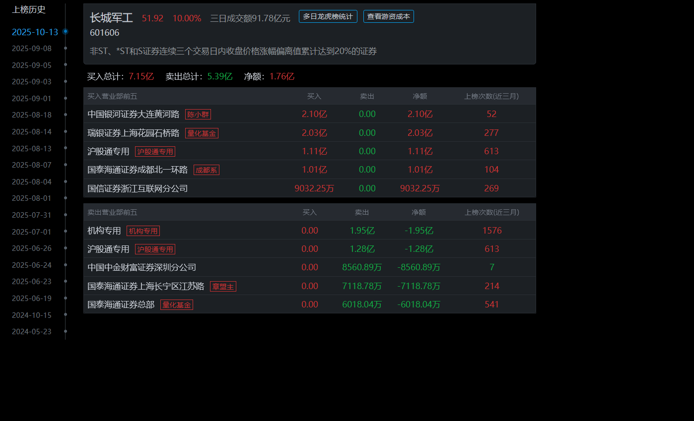 长城军工今日游资龙虎榜席位上榜数据如下!