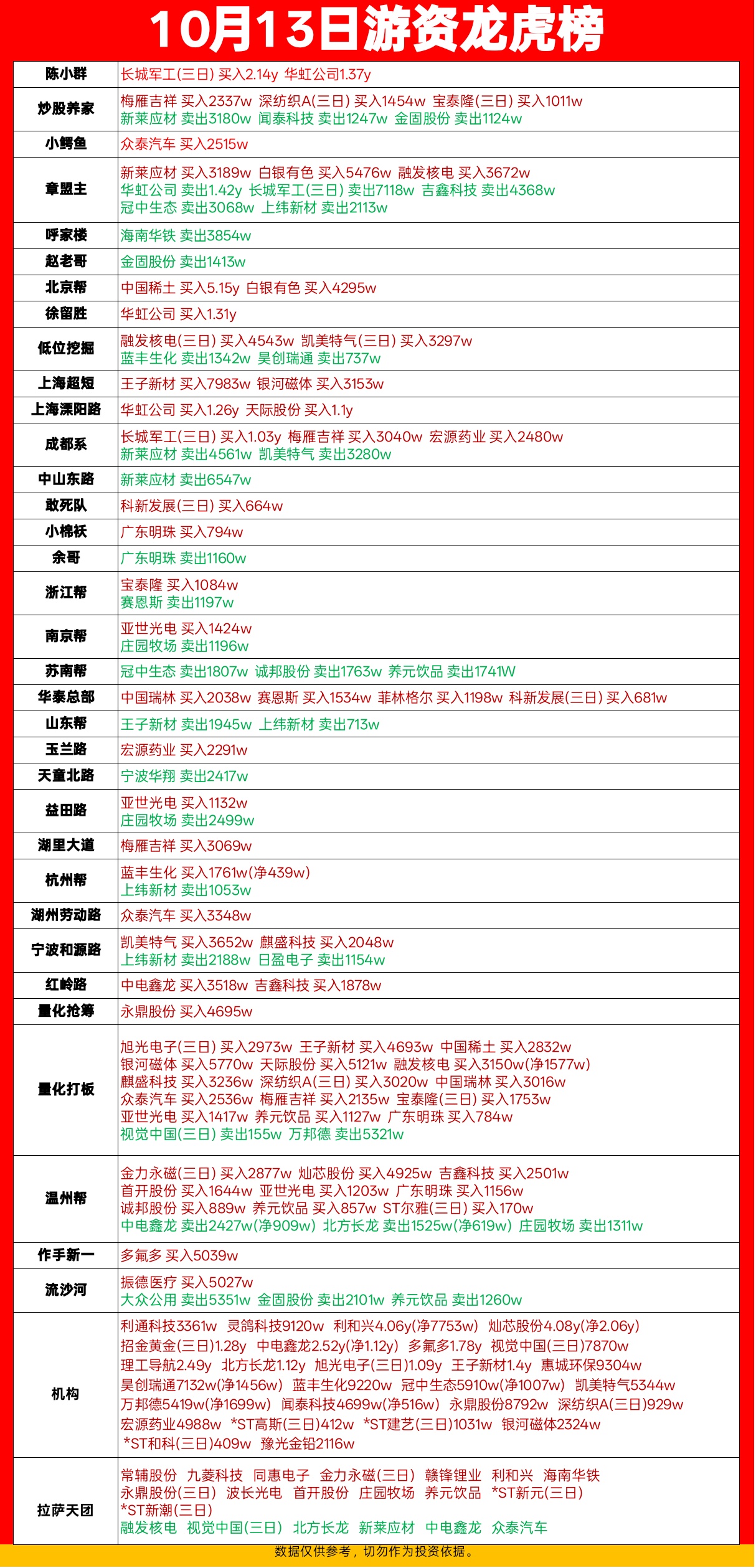 10.13游资龙虎榜,陈小群章盟主呼家楼上榜。