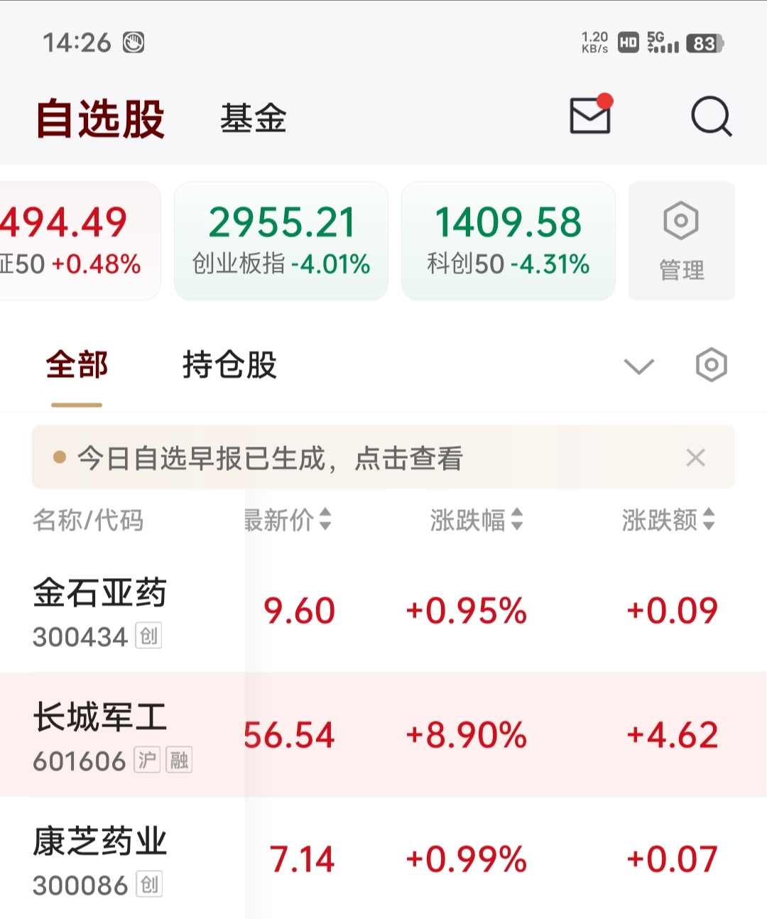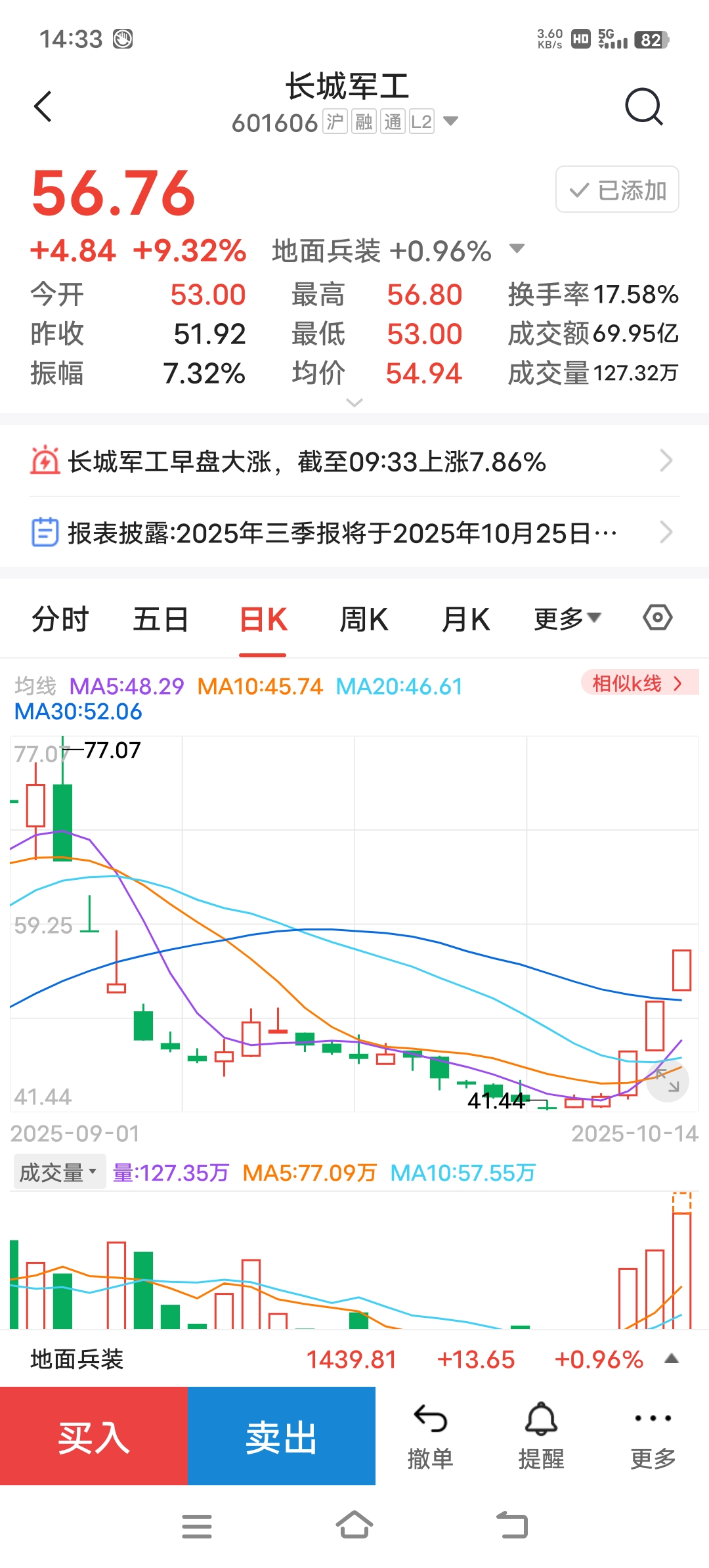 跟长城军工一起调整得差不多了:今天不跌是红的!