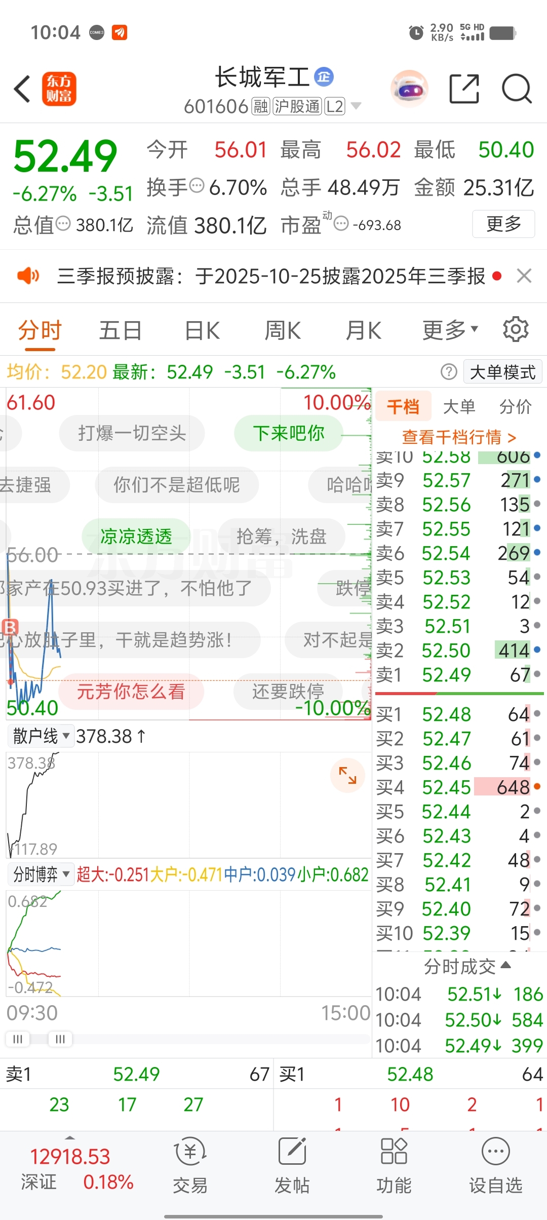 $长城军工(SH601606)$ 51.02进的,应该悬了