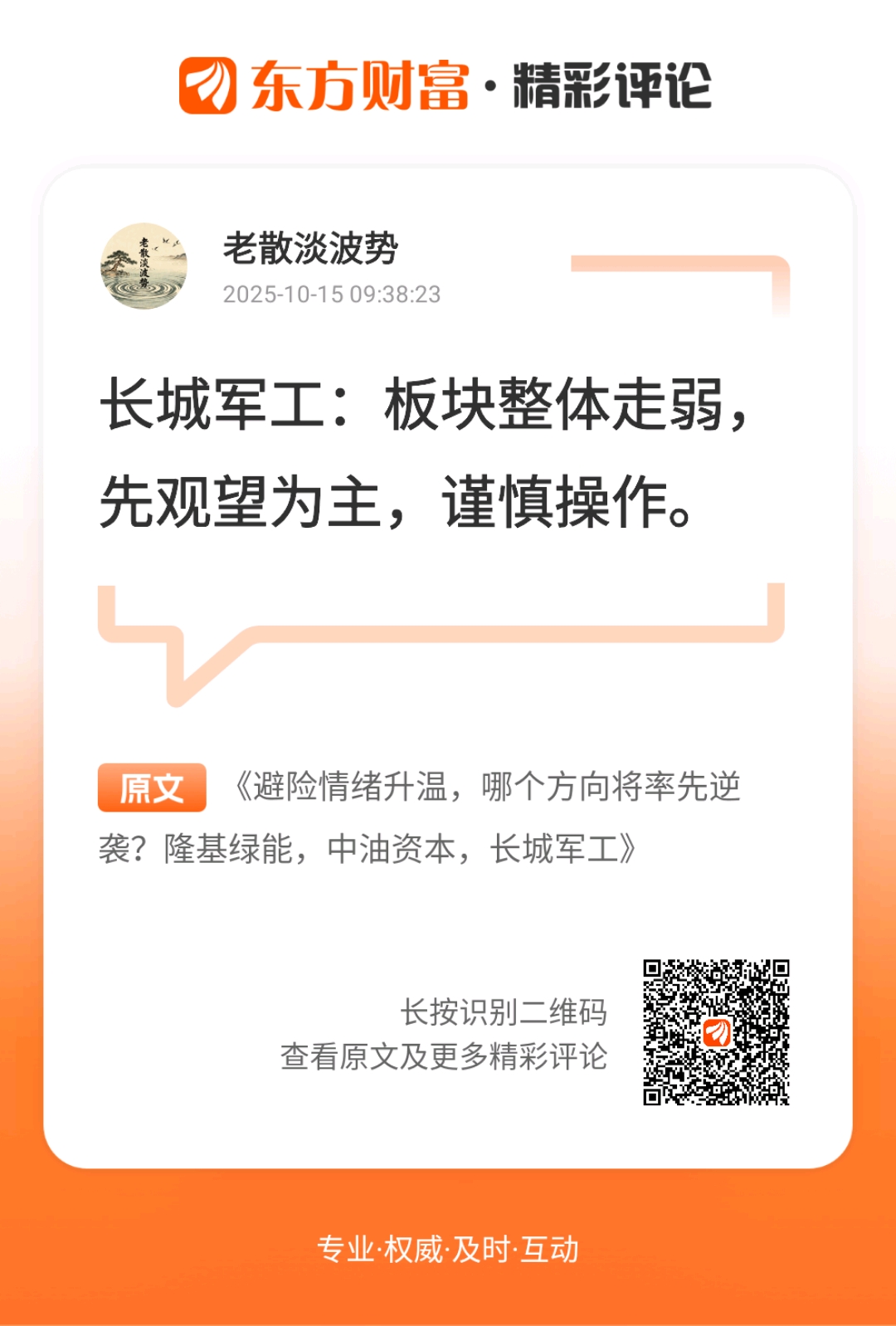 感谢老师的悉心指导,您的建议让我少走了不少弯路。//@老散淡波势 :$长城军工(SH601606)$:板块整体走弱,先观望为主,谨慎操作。