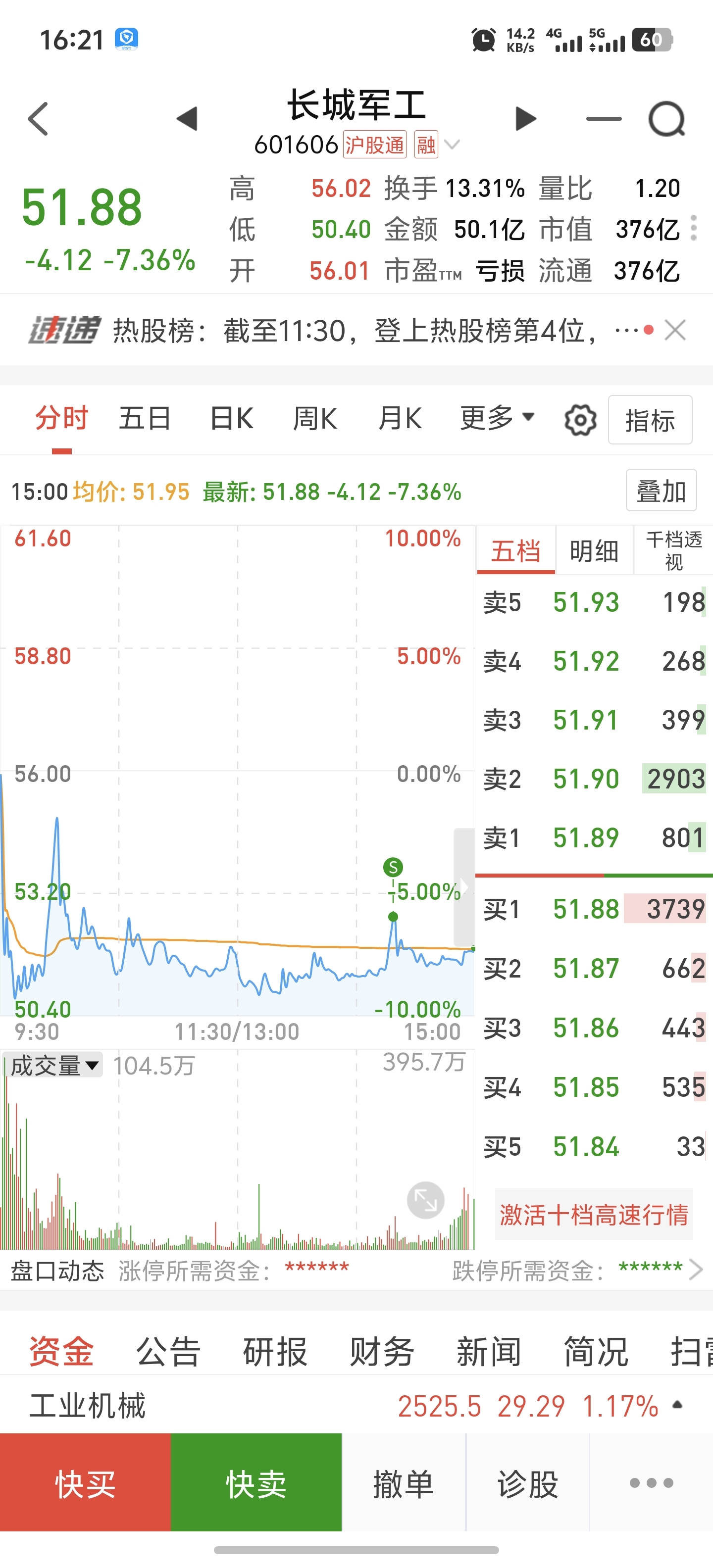 $长城军工(SH601606)$ 割肉出局,不玩了。