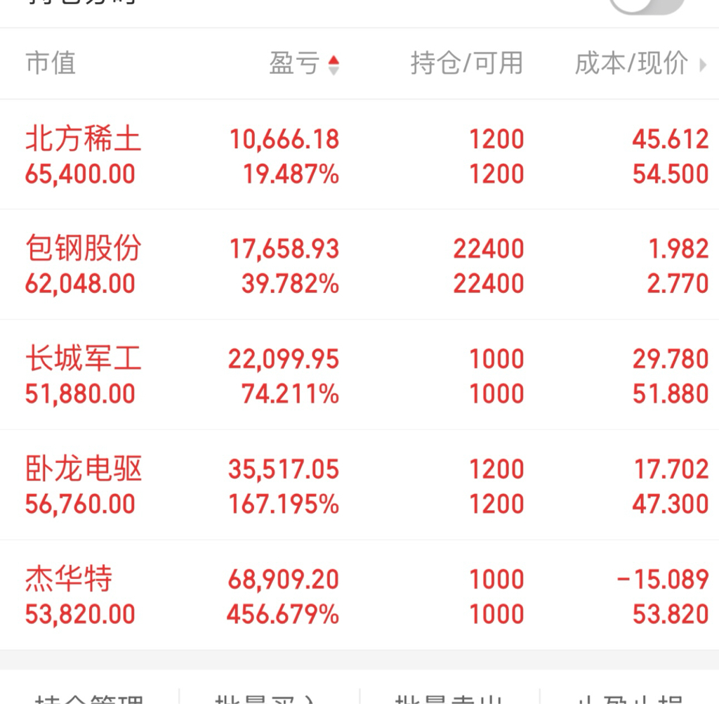 昨天说过,今日补跌的话就选择减仓,摊摊成本。今日北方稀土 包钢股份 长城军工都已不同程度减仓。包钢2.5、北稀51,死守成本价,不到成本价不出。这也是下跌过程中保证前期利润的一种操作手法。$长城军工(SH601606)$ 的话,由于成本稍低,就先继续观察,明日若继续大跌,可考虑出手,跌幅不大或上涨,都可继续观察