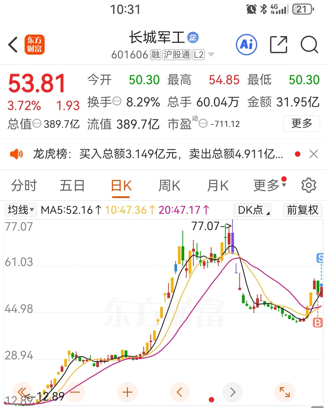 $长城军工(SH601606)$ 6月份就关注你一直不敢下手,终于还是吃了一口,撤退