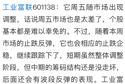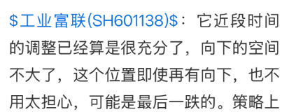 $工业富联(SH601138)$:它昨天如期反转的大阳线,短期已经重新走好了。比较难得的是,前面几天坤哥就觉得它跌不动了,在文里跟踪分析也讲了它调整的很充分了,短期向下空间不大了,可以跟踪波段企稳。果然是这样啊,昨天开始大幅反弹企稳。短期策略上,继续多些耐心陪着了,还有反弹预期的。工业富联,坤哥坚守几个月了,很多都有见证,一直在跟踪分析,结果是相当不错了。